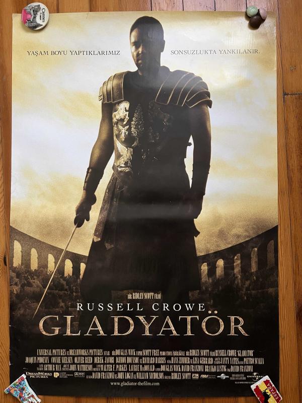 Ridley Scott’un Oscar ödüllü başyapıtı Gladiator /Gladyatör filmine ait orijinal dönem baskısı sinema afişi. Başrollerde Russell Crowe, Joaquin Phoenix, Connie Nielsen ve Richard Harris yer alıyor. 2000 yılında vizyona giren bu efsane film, epik atmosferi ve unutulmaz müzikleriyle sinema tarihinin en özel yapımlarından biri olarak kabul edilir. Ölçüler: 68 x 98 cm Durum: Afişin ön yüzü oldukça iyi durumda olup görsel bütünlüğü korunmuştur. Renklerde solma yoktur. Arka yüzeyde zamanla oluşmuş ufak noktasal lekelenmeler mevcuttur. Yırtık, eksik parça veya ciddi deformasyon yoktur. Genel olarak iyi koleksiyonluk durumdadır. Rulo halde özenli biçimde paketlenir ve güvenli şekilde gönderilir.