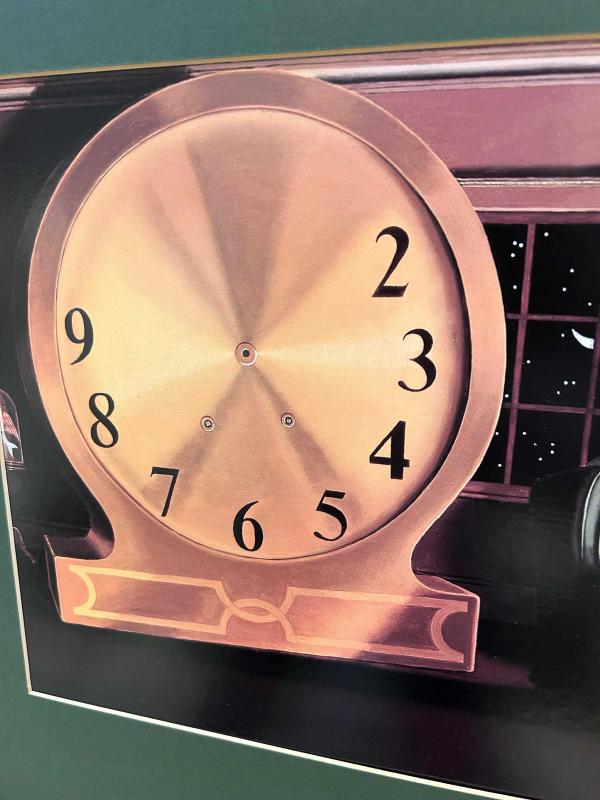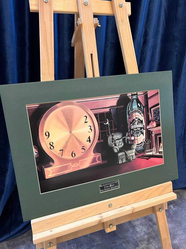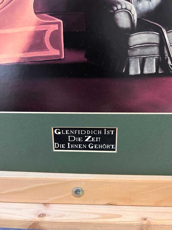 Bu görsel, Glenfiddich markasına ait sanatsal bir reklam panosunu veya dekoratif bir ürünü göstermektedir. Ürün: Glenfiddich Pure Malt viski temalı bir tablo/poster. İçerik: Resimde bakır renkli bir saat, viski şişesi ve rahat bir koltuk yer almaktadır. Mesaj: "Glenfiddich ist die Zeit die Ihnen gehört" (Glenfiddich size ait olan zamandır) ifadesi geçmektedir.
