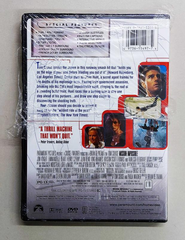 1996 yılında vizyona giren, başrolünde Tom Cruise'un yer aldığı dünyaca ünlü Mission Impossible serisinin ilk halkası. 1998 yılında basılmıştır. Hiç açılmamıştır. Üretildiği yıldan bu yana -yaklaşık 28 yıldır- fabrika ambalajında durmaktadır. Bu sebeple son derece nadirdir. Fotoğraflardan görebileceğiniz üzere ambalajının arka tarafından yırtık mevcuttur. Üründe herhangi bir deformasyon veya hasar söz konusu değildir. Yurt dışı baskısı olması sebebi ile Türkçe seçenekler mevcut değildir. Kutulu DVD film arşivi yapanlar ve serinin hayranları için bulunması zor,nadir ve koleksiyonluk bir üründür.