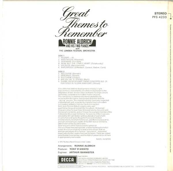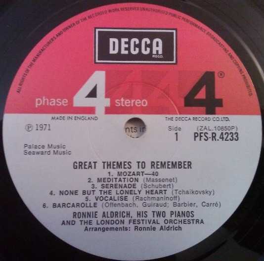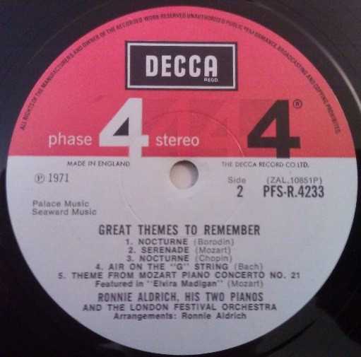 Fotoğraftaki gibi temiz, çok titiz kullanılmış, ilk sahibinden, kütüphane plağı. Ronnie Aldrich And His Two Pianos* With The London Festival Orchestra* – Great Themes To Remember Label:Decca – PFS 4233 Series:Phase 4 Stereo – Format:Vinyl, LP, Stereo Country:Türkiye Released:1972 Genre:Classical Tracklist Position Title/Credits Duration A1 Mozart - 40 A2 Meditation A3 Serenade A4 None But The Lonely Heart A5 Vocalise A6 Barcarolle B1 Nocturne B2 Serenade B3 Nocturne B4 Air On The G String B5 Theme From Mozart Piano Concerto No. 21 Featured In Elvira Madigan