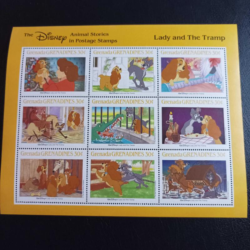 Grenada Grenadines tarafından çıkarılan, Disney'in "Lady and The Tramp" (Leydi ile Sokak Köpeği) filminin sahnelerini içeren 9'lu hatıra bloğu MNH