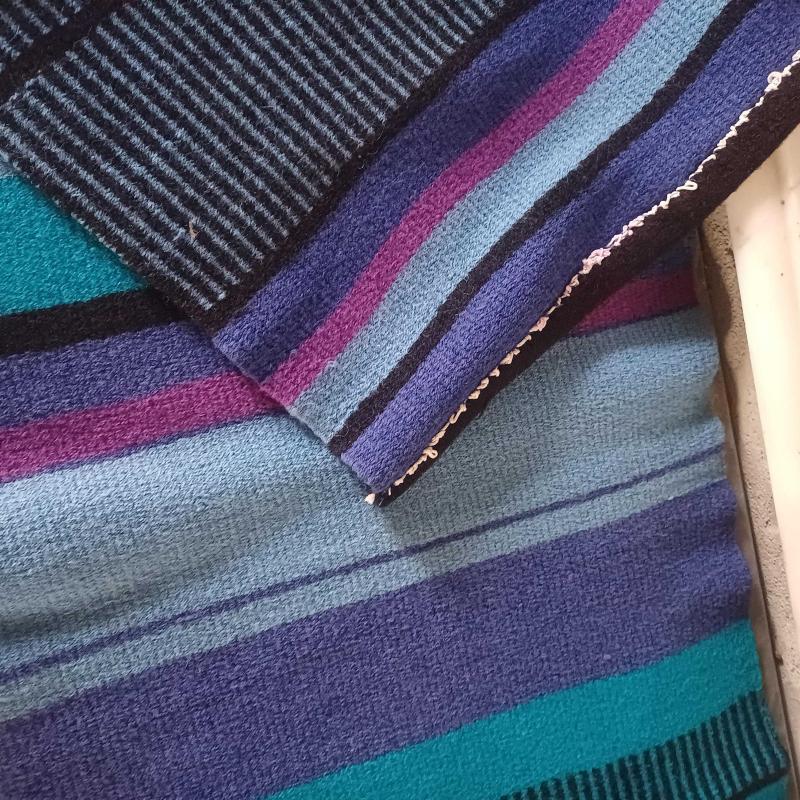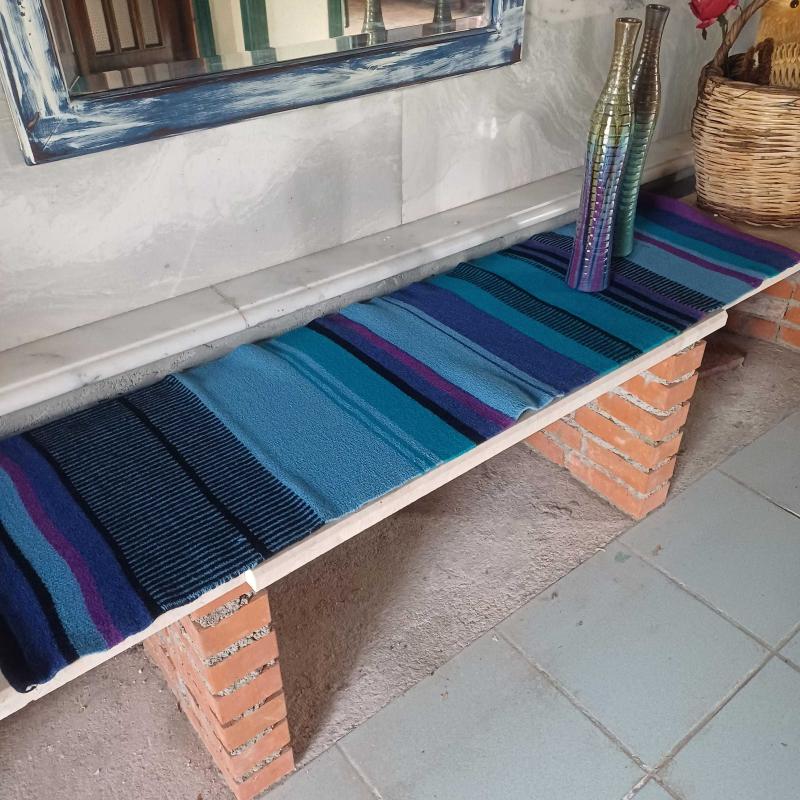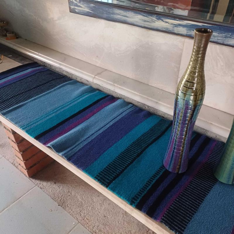 Taa uzak yollardan evimize çıkmış gelmiş. 1990 'lar. Yaklaşık 35 senedir bizimle olmuş. Çok sevdik.O yüzden de çok iyi baktık. El dokuma. Geleneksel Güney Amerika Dokuma. Renkler nefes kesici. Bir kusuru çizgisel bir minik kahverengi leke ( bkz foto ).O da kuru temizleme ile çıkacaktır. Olcu 140 x 40 cm Çift taraflı temiz dokuma.