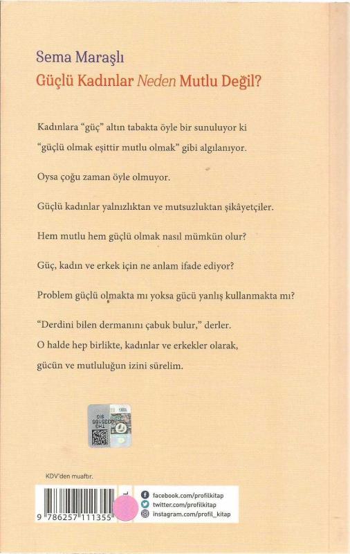 Güçlü Kadınlar Neden Mutlu Değil? (ÜRÜN AÇIKLAMA BÖLÜMÜNE BAKINIZ.), Sema Maraşlı tarafından kaleme alınmıştır. Kitap 2020 yılında Profil Kitap tarafından [İstanbul] 9786257111355 ISBN kodu ile yayınlanmıştır. Satışta olan kitap, yayınevinin 1. baskısıdır. 212 sayfadır. Güçlü Kadınlar Neden Mutlu Değil? (ÜRÜN AÇIKLAMA BÖLÜMÜNE BAKINIZ.) adlı eser Türkçe dilindedir.