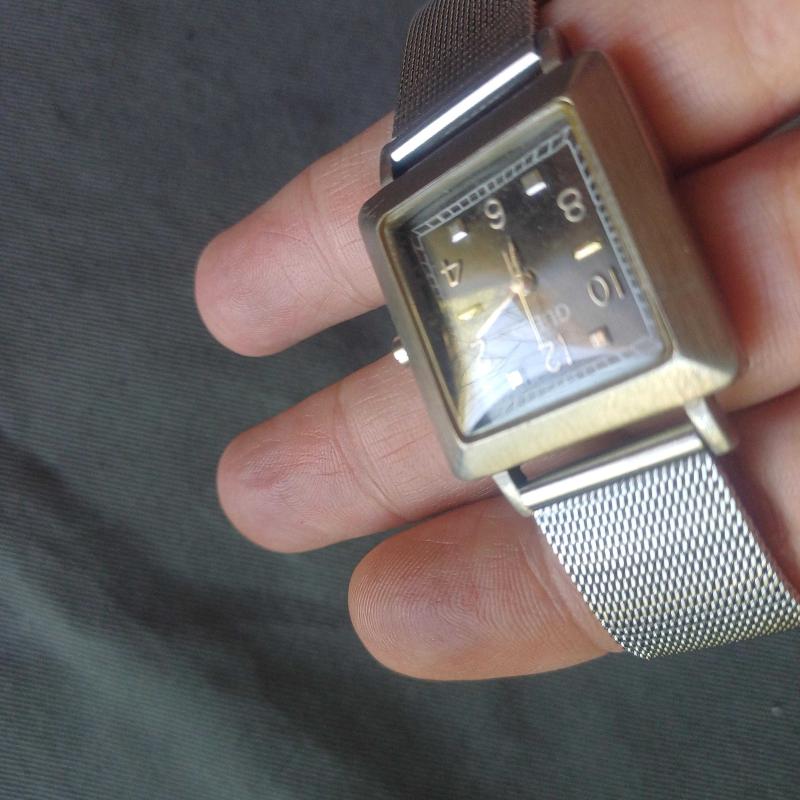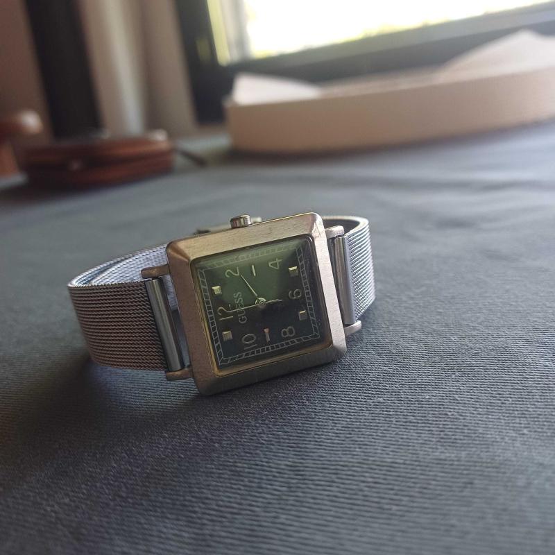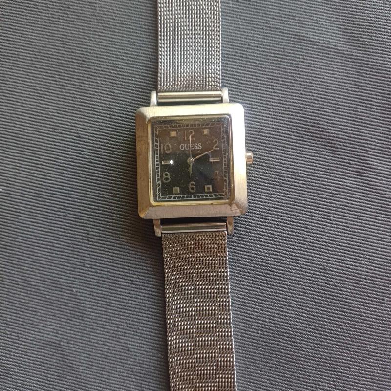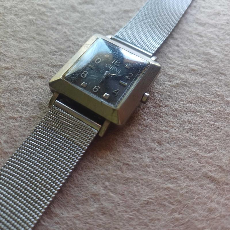 Guess Marka. Yil 1996. Gümüs rengi paslanmaz celik kayiş. Siyah kadran. Gumus rengi kasa. Japon mekanizma. Kadin kol saati. Çalisir vaziyette. Kullanılmiş.Vintage kondisyonda. Sıfir bir urun DEĞILDIR. Birinci elden. Vintage olarak cok iyi kondisyonda. Orjinal kutusu ,kitapcigi ve sigorta belgesi ile beraber. Sadece bir pil taktirmaniz gerekecektir. 2,5 x 2,5 cm kadran 1,8 cm celik bileklik genisligi