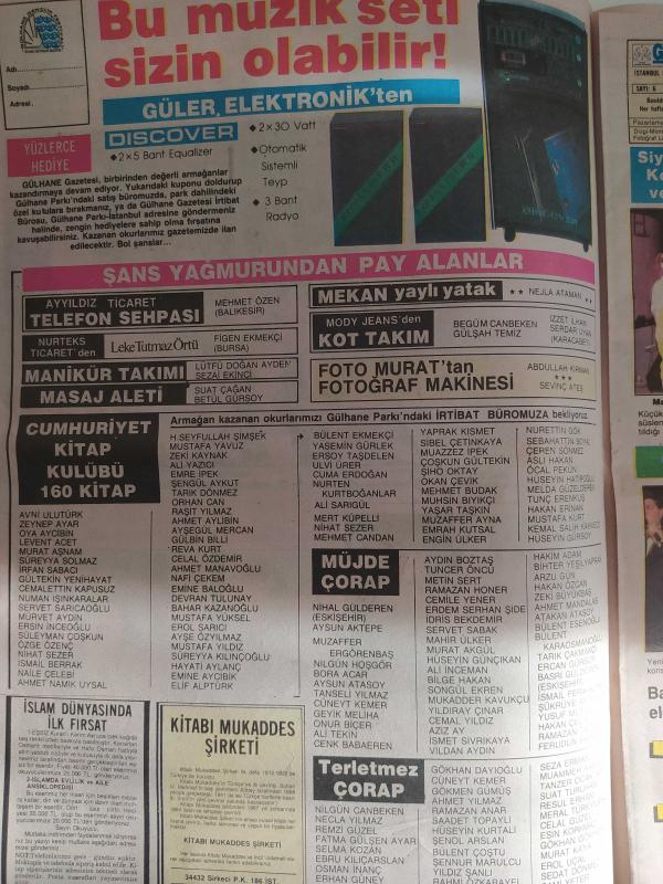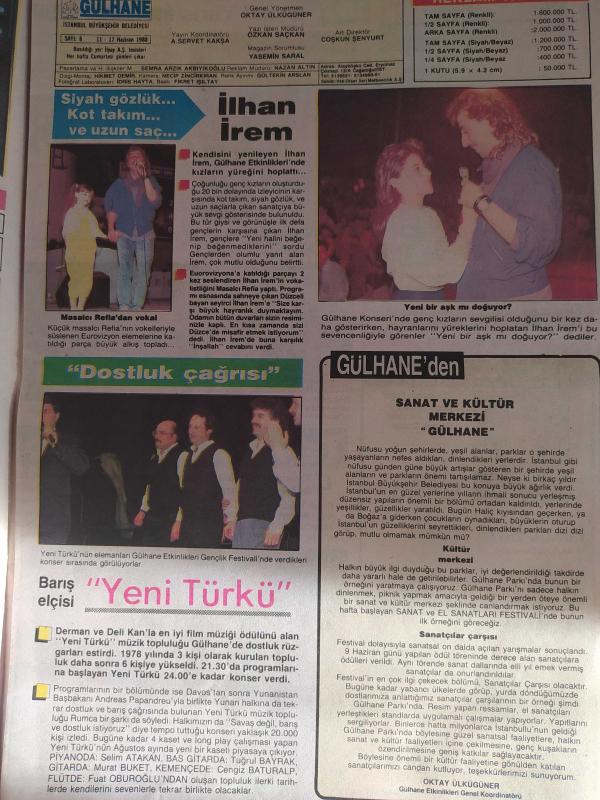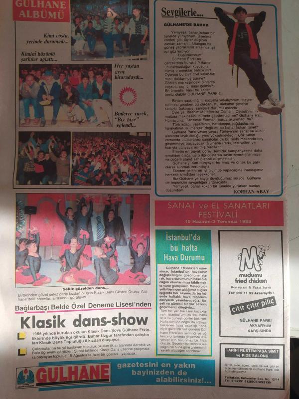 Gülhane Aylık Gazetesi - 11-17 Haziran 1988 - Sayı:6 - Sibel Egemen'in yarattığı rengarenk bir gece - Ramazan Turgut - Bir milyonuncu ziyaretçi - Özay Erkılıç - Hamit Kırnaytürk - Avni Akyol - Mehmet Yazar - Siyah gözlük Kot takım ve uzun saç - İlhan İrem - Barış elçisi ''Yeni Türkü'' - Sanat Yarışmalarının ödülleri dağıtıldı - Tavernadan 2 konuk - Ersan Tekin - Hikmet Talı - İnal Alpay - Saadet Aydıntürk - Susuzluğu tarihe gömüyoruz! - Mahsun Şerif - Mamudo Kurban kaset reklamı - Gülhane Albümü - İstanbul'da bu hafta Hava Durumu - Bağlarbaşı Belde Özel Deneme Lisesi'nden - Klasik dans show fotoğraf ve haberi - Tam Takım Gazete Yıpranma, sararmalar, kupon kesiği ve yırtılmalar zamana bağlı olarak görülebilir
