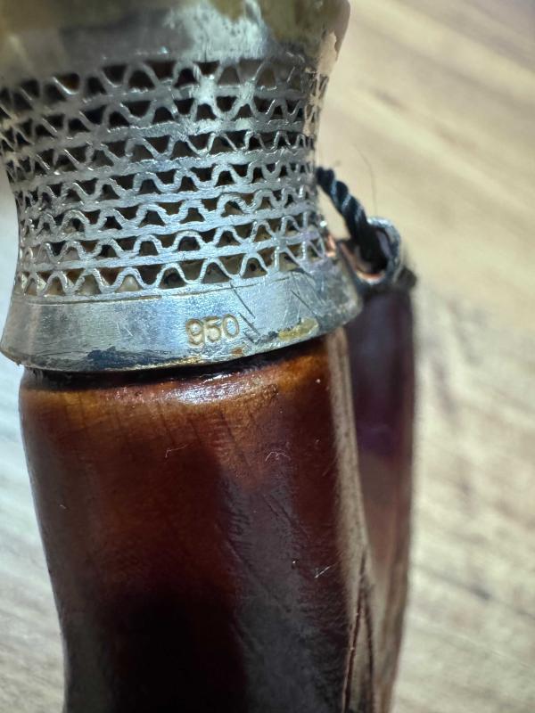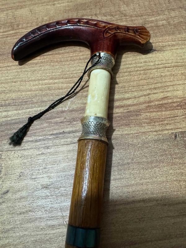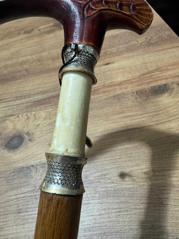 Gümüş Damgalı,Fil dişi ve Ahşap El İşçiliği Sedef işlemeli Özel yapım Baston 1992 Özel Yapım - 950 Ayar Gümüş bilezikler ara kısmında Fil dişiyle yapılmış Koleksiyonluk Baston Kaliteli ahşap gövde ve oymalı sap. Temiz, bakımlı ve koleksiyonluk kondisyonda. Hem kullanım hem de dekorasyon için uygun, nadir bir parçadır. Boy 87 cm, en son 3 ay önce güncellenmiştir.