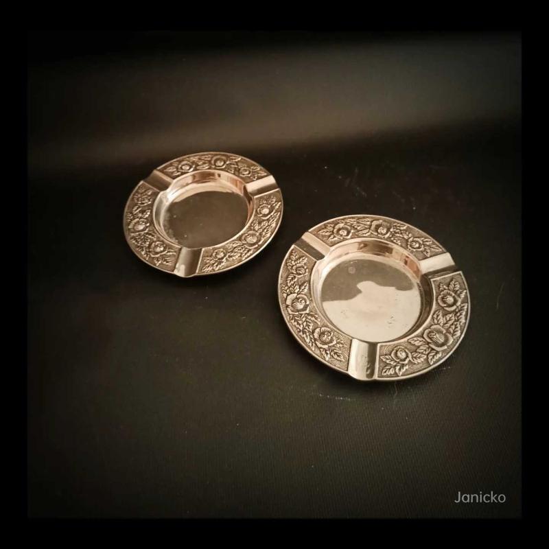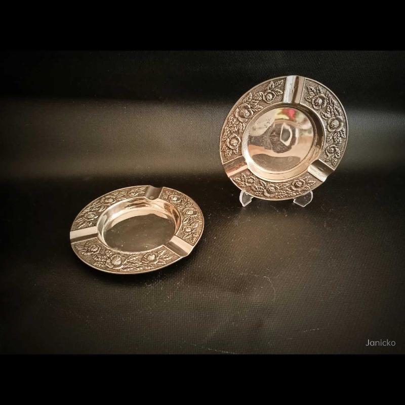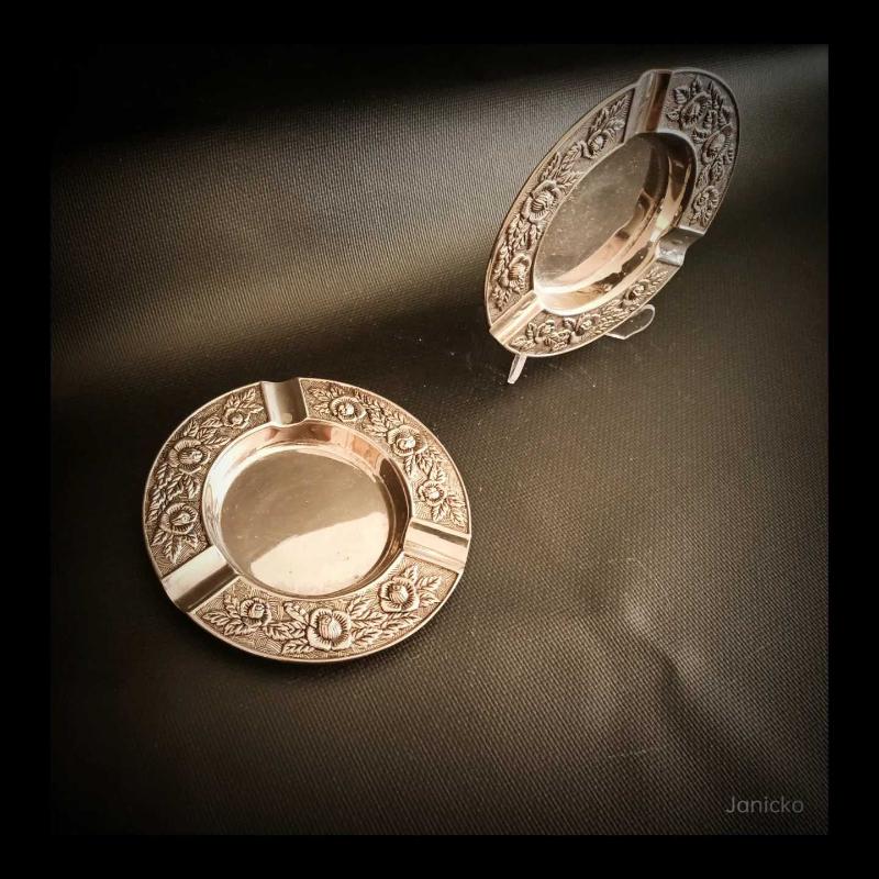 Yüzyıl ortası, gül kabartmaları ve kalem işçiliği ile formlandırılmış, alpaka üzeri gümüş kaplama puro küllükleri bizlerle. Danimarka'da alınmış ve oldukça ağır bu parçaların çapları 13 cm'dir. Harika bir dekorasyon tamamlayıcısı olan yuvarlak kültablası çiftinin, kondisyonu kusursuz durumdadır.