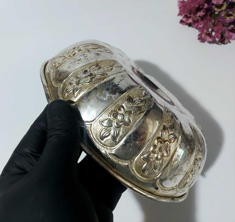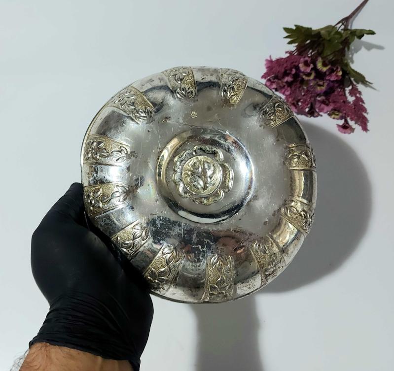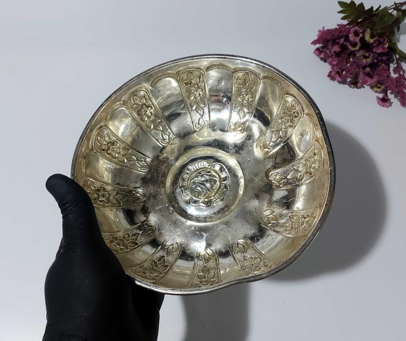 Eskilerden Şifa tası - Hamam Tası Temiz ürün etli ağır malzeme Gümüş kağlama- arkasında damga da var Bitkisel motifli YAMULMUŞ BİRAZ - BU NEDENLE UYGUN FİYAT Ölçü Sonda - İade Yoktur