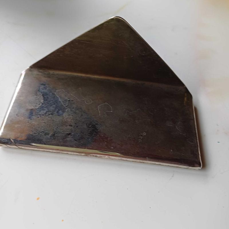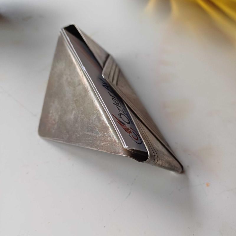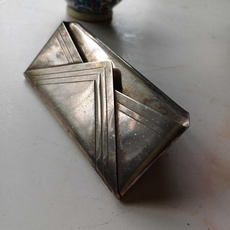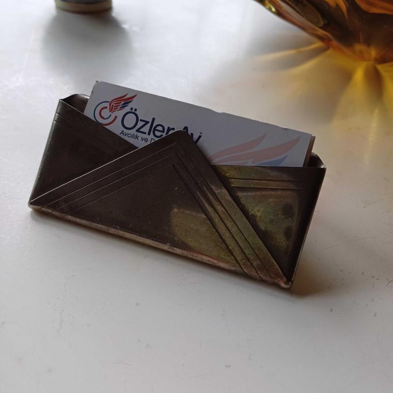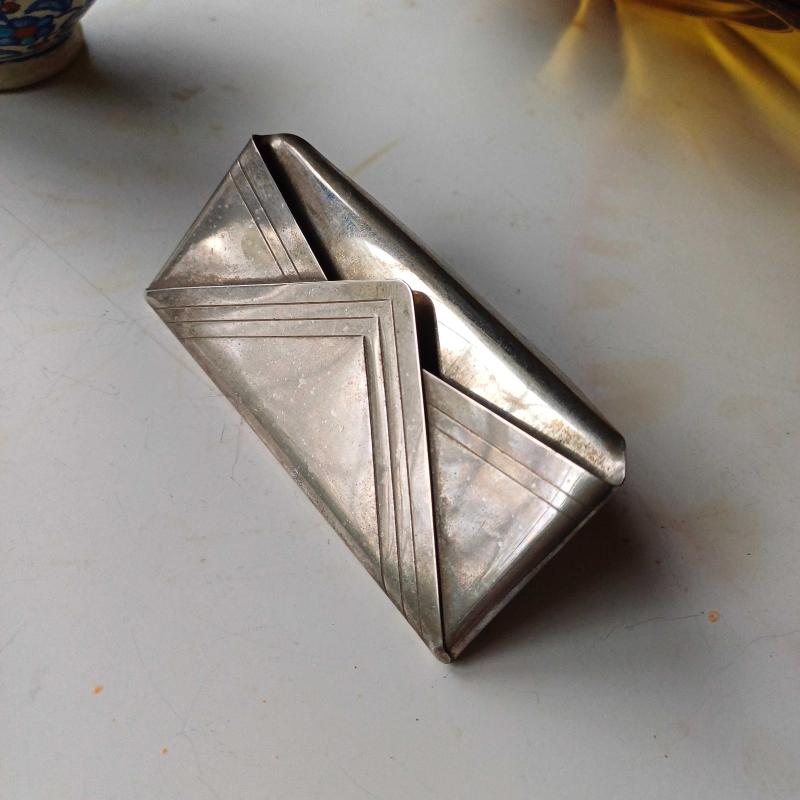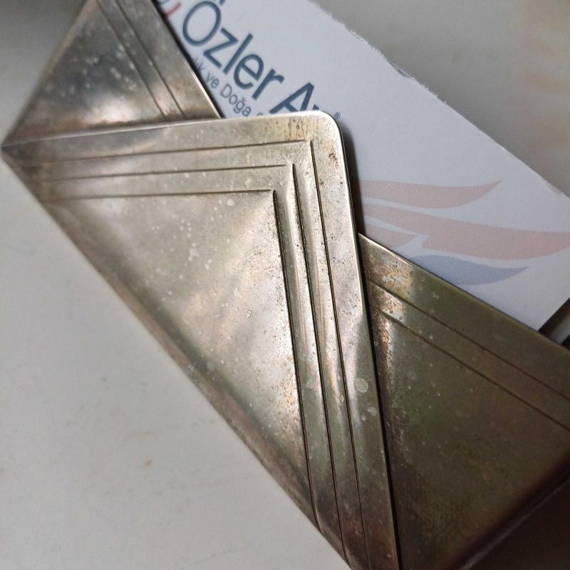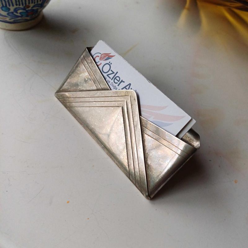 Gümüş levhadan , kivrilmak suretiyle imal edilmis ,zarf şeklinde kartvizitlik. Kültür ve Turizm Bakanlığı,Dösim Mağazasından alınmış,özel tasarım 925 ayar. KAPLAMA DEGILDIR. Nadir bir ürün. Koleksiyonluk. Hediyelik. 1980.