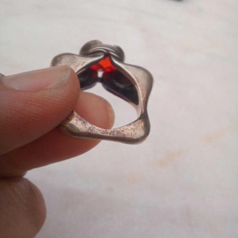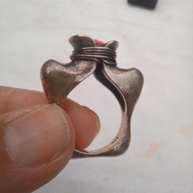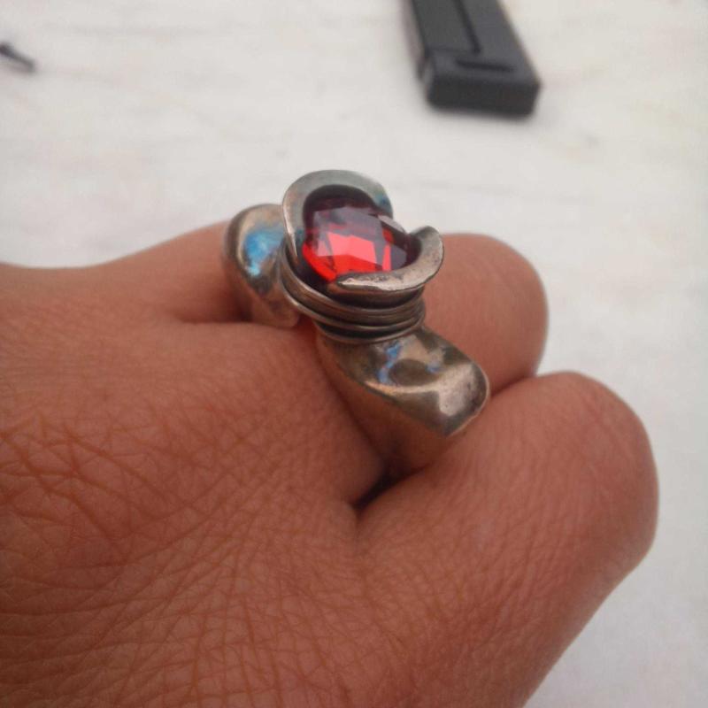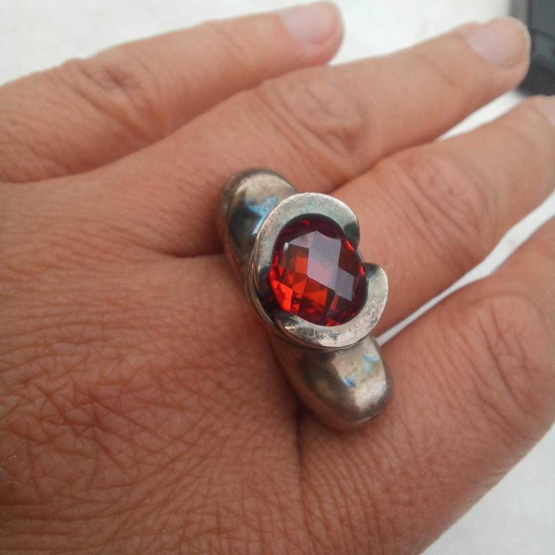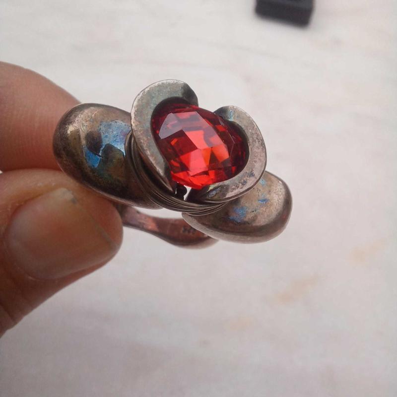 1990'li yillarda satin alinmis ozel tasarim yuzuk. Faset kesimli kirmizi (narcicegi) taş.Alirken lal taşi oldugu doulenmusti ancak zirkon da olabilir. Sadece bir parlatmaniz gerekecek. 19 gram agirliginda. 925 ayar gumus. Damgali.