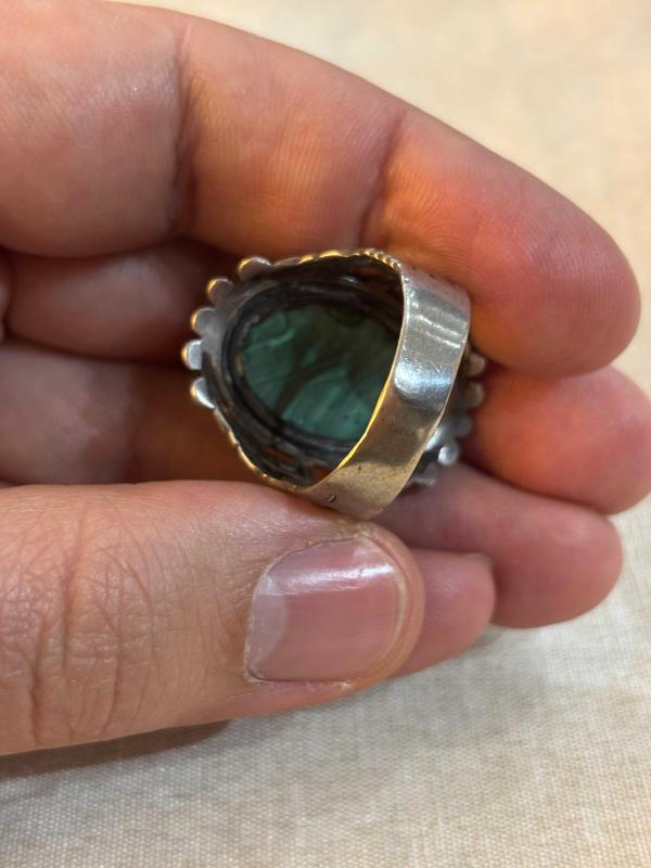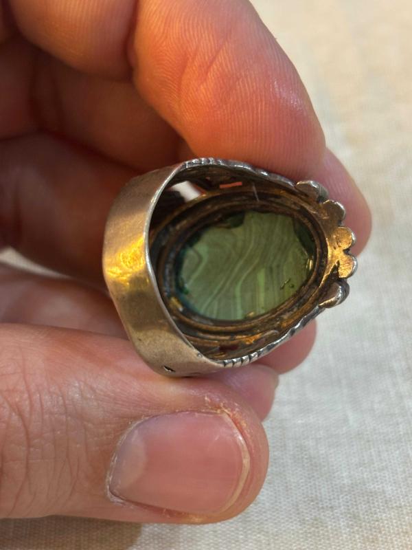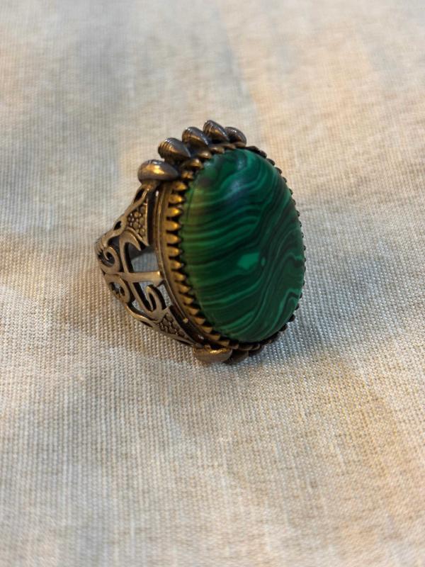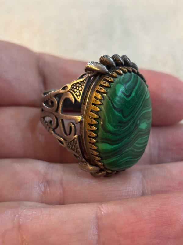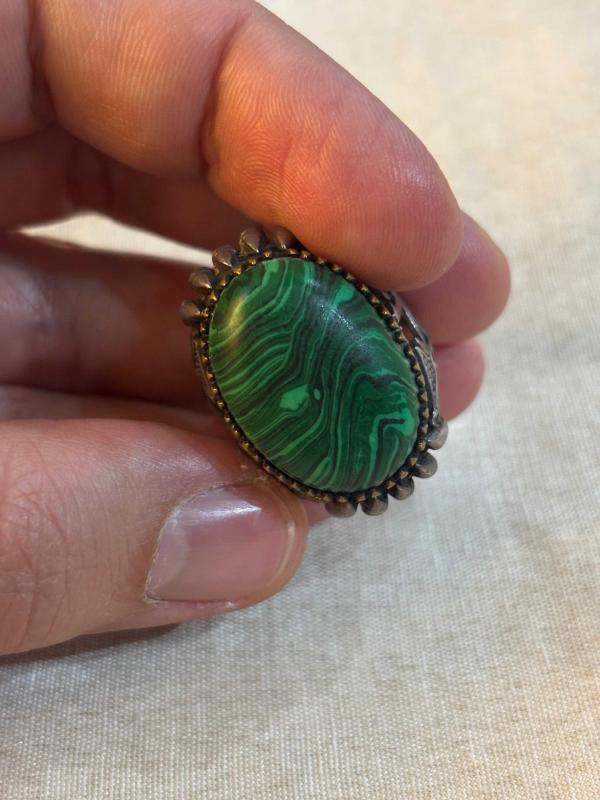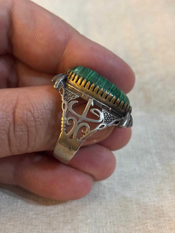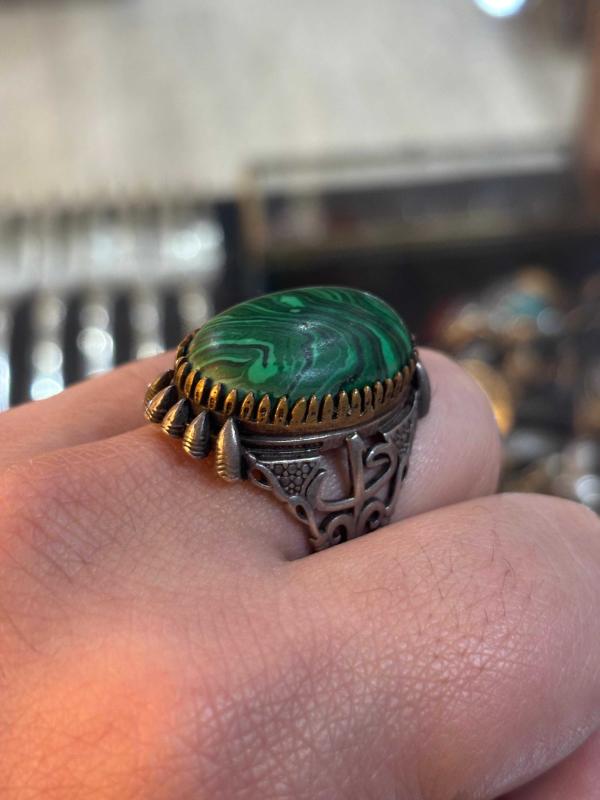Malahit taşlı gümüş yüzük. Yüzüğün ağırlığı 13 gram ve parmak ölçüsü 28’dir
