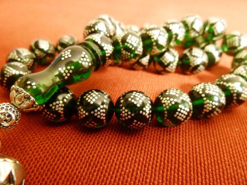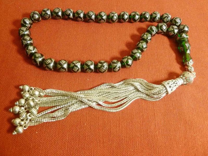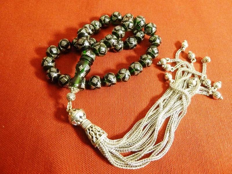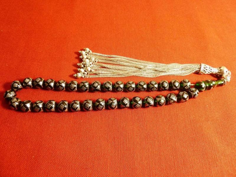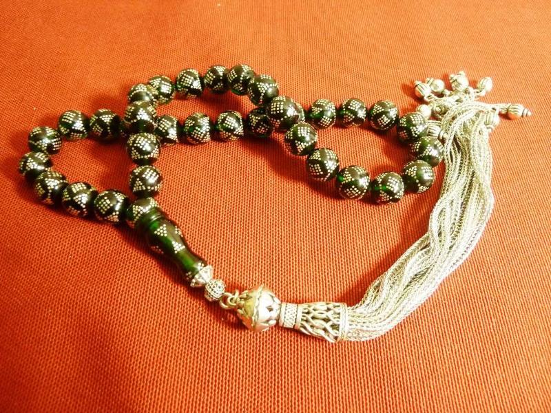 Gümüş püsküllü, gümüş işlemeli, usta işi yeşil ateş kehribar 33'lük tesbih. Püskül dahil 38cm., en son 2 yıl önce güncellenmiştir.