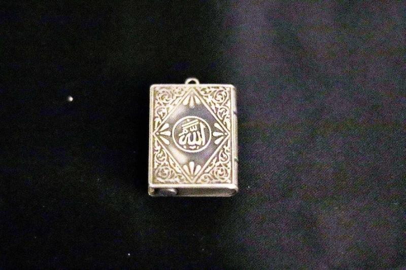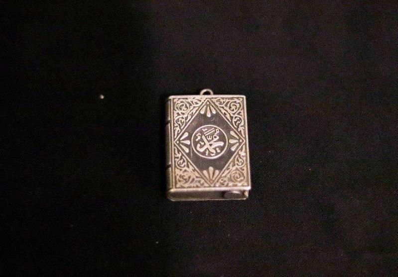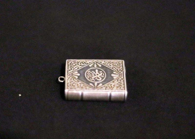 Gümüş, tuğralı, sürgülü kapaklı, kabartma, el kakması Kuran kabı cevşen kolye ucu. 2,5x3,3cm. başlıklı antika/koleksiyon objesinin menşei belirtilmemiştir. Objenin ait olduğu dönem bilinmeketedir.