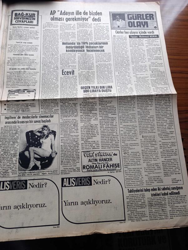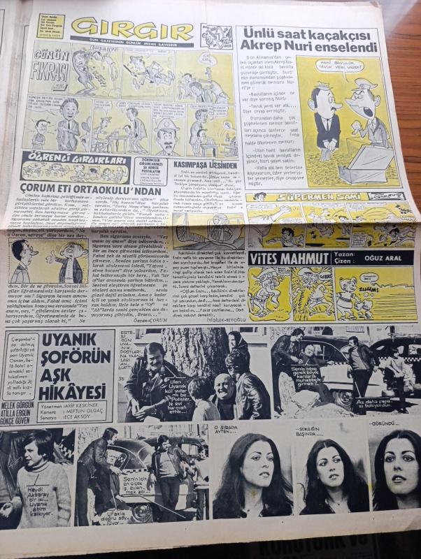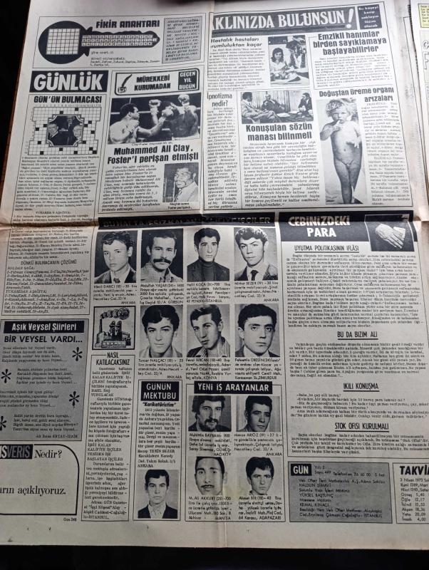 Gün Gazetesi - Turkish Newspaper - 3 Nisan 1973 - verginin getirdiğini zam götürüyor - geçen yılki bin lira 900 liraya düştü - Gaziantep Antalyaspor maçı dönüşü denize uçan arabadan 5 ceset çıkarıldı Fotoğrafı - Bülent Ecevit 12 mart'tan sonra kendilerine iktidara geçme teklifi yapıldığını açıkladı - Gürler olayı yazan Mehmet Kemal yazı dizisi - cumhurbaşkanlığı seçimi için 13. tur atıldı - Pala Mustafa Burası Mahmutpaşa çizen Aydın Aliustaoğlu - yayınlanan bildiriye göre Adalet Partisi başkanın ille de bizden olması gerekmez diyor - Hacı Hüsrev'in yankesici kadınları Ankara'da yakalandı Fotoğrafı - geçen yıl bugün Muhammed Ali Clay Foster'ı perişan etmişti Fotoğrafı - gırgır mizah sayfası - uyanık şoförün aşk hikayesi oynayanlar Melek Görgün Atilla Ergün Gökçe Güven Foto Roman - Taçlı Fahişe Teodora yazan Azmi Nihad Erman Yazı Dizisi - Keloğlan masalı çizen Ferit Öngören Yazı Dizisi - İstanbul'u titreten yakışıklı kabadayı ustura Kemal çizen Haldun Sevel - peygamber efendimizin hayatı adlı eser, Kitap > Süreli Yayınlar > Gazeteler > Türkiye > Genel > Günlük kategorisinde İkinci El olarak satıştadır.
