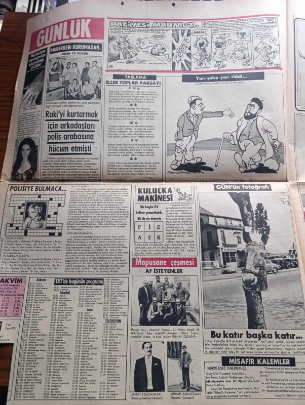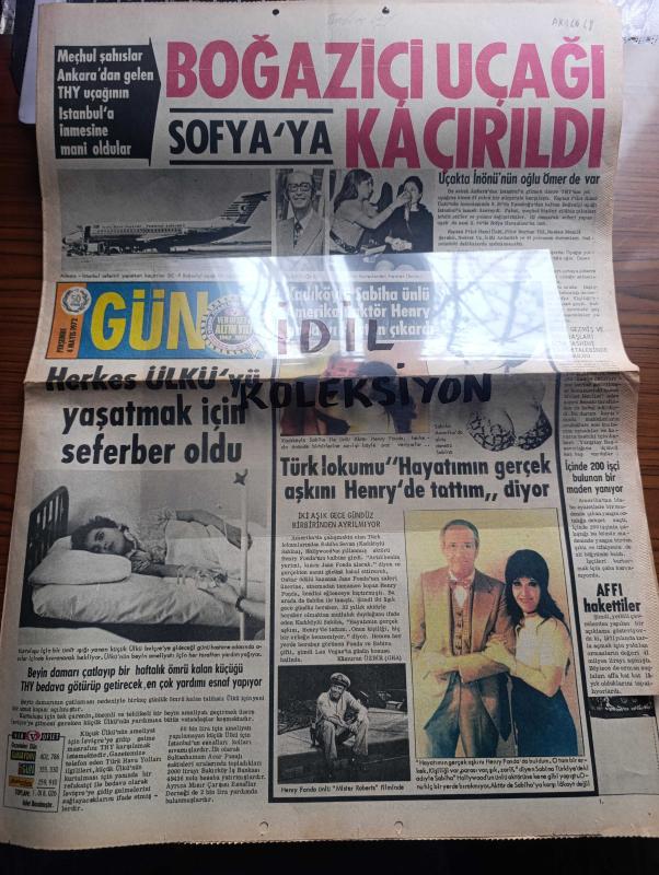 Gün Gazetesi - Turkish Newspaper - 4 Mayıs 1972 - Boğaziçi uçağı Sofya'ya kaçırıldı - uçakta İsmet İnönü'nün oğlu Ömer İnönü'de var Fotoğrafı - Ankara İstanbul seferini yaparken kaçırılan DC 9 Boğaziçi uçağı bir uçuştan evvel Fotoğrafı - kaçırılan hosteslerden Nedret Uz Fotoğrafı - uçağı kaçıranlar Deniz Gezmiş ve arkadaşları için tashihi karar talebinde bulundu - Türk lokumu kadıköylü Sabiha Sevan Amerikalı aktör Henry Fonda'yı baştan çıkardı Fotoğrafı - herkes küçük Ülkü'yü yaşatmak için seferber oldu Fotoğraf - yarı şaka yarı ciddi karikatür - hafiyesi Mahmut çizen Oğuz Aral - meşhurların parmağından çıkarmadığı yüzükler - Seher Şeniz Fotoğrafı - TRT'de bugünün programı - Şantöz Mine Sun iççamaşırı giymekten çok sıkılıyormuş - Manisalı erkeklerin gözleri bayram etti fotoğraf - Ömür Pınar 3 sene çalışıp saman çöpünden tablolar yaptı - Hacı Leylek her yıl aynı yuvaya konuyor Fotoğrafı - İzmirli Selma Taşbebek nargile tiryakisi oldu Fotoğraf - Türkiye'yi bırakamayan şantöz Kohava adlı eser, Kitap > Süreli Yayınlar > Gazeteler > Türkiye > Genel > Günlük kategorisinde İkinci El olarak satıştadır.