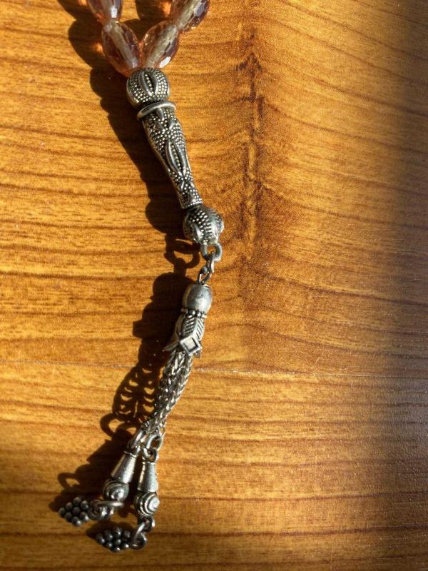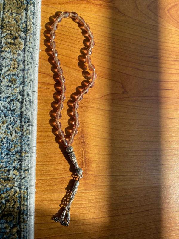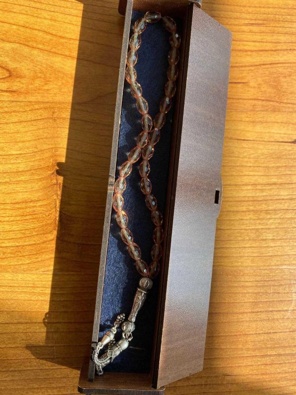 Gün içinde renk değiştiren tesbih. Ahşap Kutusunda, gün ışığına bağlı olarak lila, mor, yeşil renklere dönüşüyor. Tanelerin ele gelmesi uyumludur.