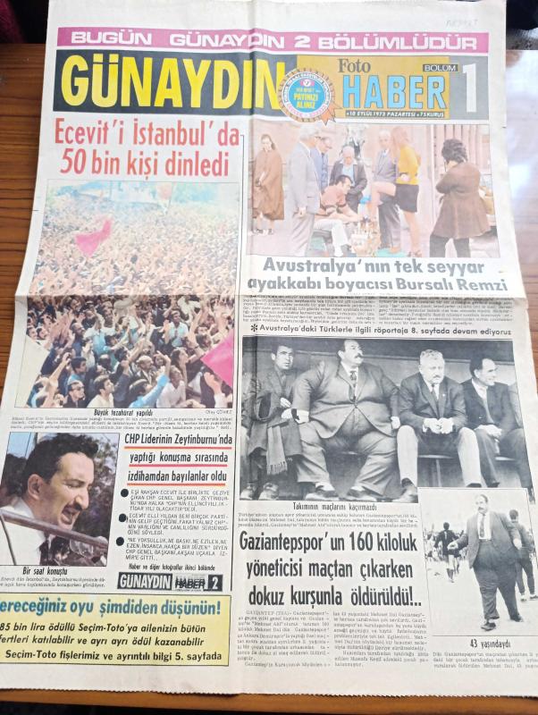 Günaydın Foto Haber 1 Gazetesi - 10 Eylül 1973 - Bülent Ecevit'i İstanbul'da 50 Bin Kişi Dinledi - CHP Lideri Bülent Ecevit Zeytinburnu'nda Yaptığı Konuşma Sırasında İzdihamdan Bayılanlar Oldu - Avustralya'nın Tek Seyyar Ayakkabı Ve Boyacısı Bursalı Remzi Atlamaz - Gaziantepspor'un 160 Kiloluk Yöneticisi Mehmet Dai Maçtan Çıkarken Dokuz Kurşunla Öldürüldü - İstanbul'da Sinemalar Programı - Gazinolar Tavernalar Kulüpler Salonlar - İzzet Günay - Altan Aşar Spor Programı Sunuyor - Jim Maykıl Silahların Gölgesinde Foto Roman - Çin Falı - Samsunspor Fenerbahçe'ye Karşı 1 0 Galip - Tarihte Bugün Kapitülasyon Belasının Kaldırılışı - Galatasaray 3 Boluspor 1 - Bursaspor 1 Beşiktaş 1 - Güreşte Yine Hava Aldık - Güreşte 55 Puanla Sovyetler Birliği Birinci Oldu - Dört Dörtlük Traş Bıçağı Viking - Mektuptan Çıkan Nişanlı - Avustralya Cennetinde 20.000 Türk Röportaj Ertuğrul Akbay adlı eser, Kitap > Süreli Yayınlar > Gazeteler > Türkiye > Genel > Günlük kategorisinde İkinci El olarak satıştadır.