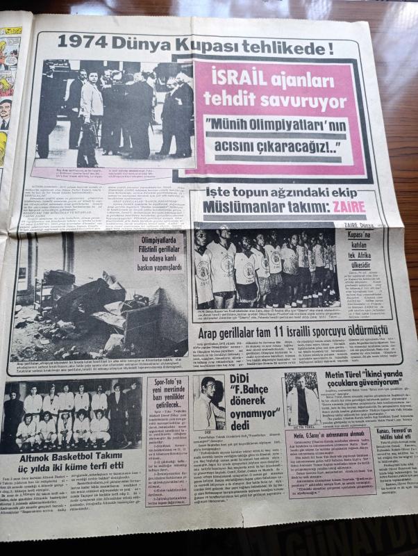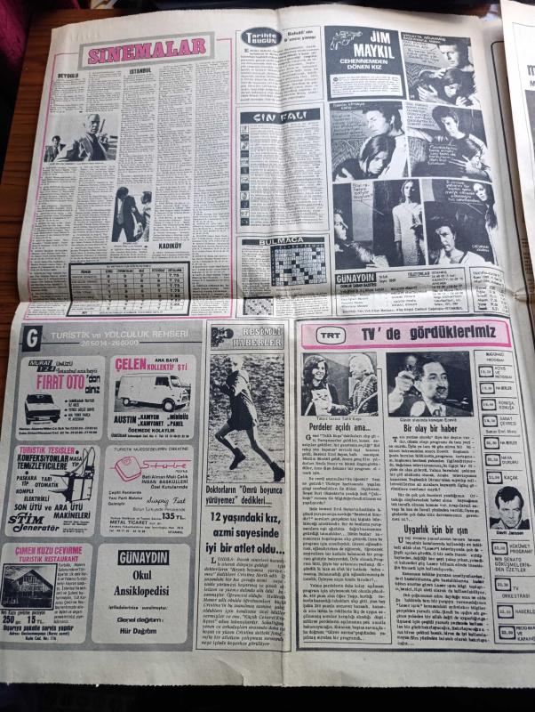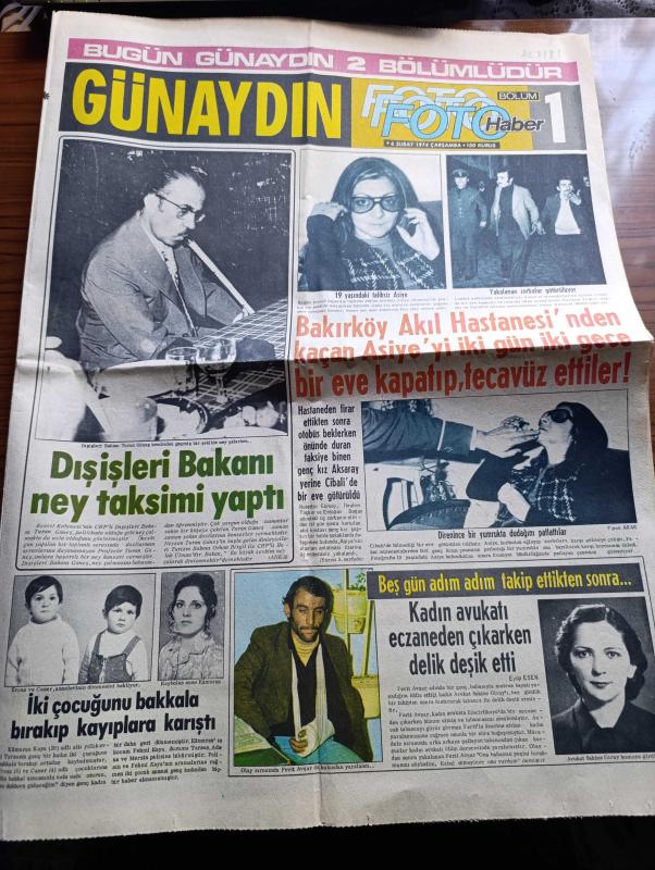 Günaydın Foto Haber 1 Gazetesi - 6 Şubat 1974 - Dışişleri Bakanı Turan Güneş Ney Taksimi Yaptı - Bakırköy Akıl Hastanesi'nden Kaçan Asiye'ye İki Gün İki Gece Bir Eve Kapatıp Tecavüz Ettiler - Tarihte Bugün Babıali'nin 9. Yarışı - Jim Maykıl Cehennemden Dönen Kız Foto Roman - Beyoğlu Kadıköy Sinema Programı - Günün Olayında Konuşan Bülent Ecevit - Bugünkü TV Programı - Balıkçılar Şimdi De Trol Ağı İle Mersin Balığının Kökünü Kazıyor - Şarkıcı Fatoş Hacıbekir Grevcilerine Akide Şekeri Dağıtarak Moral Verdi - Pendik Palmiye Gazinosu - Lido Her Akşam İftiharla Sunar Bülent Oral Ve Saz Arkadaşları - Fatih'in Fedaisi Kara Murat Yazan Rahmi Muratoğlu Çizen Abdullah Turhan - İsmet İnönü İçin Okutulan Mevlide Ailenin Çok Yakınları Çağrıldı - 1974 Dünya Kupası Tehlikede - İsrail Ajanları Tehdit Savuruyor Münih Olimpiyatlarının Acısını Çıkaracağız - İşte Topun Ağzındaki Müslümanlar Takımı Zaire - Komançi Çizgi Roman - Petrol Körfezinin İncileri Röportaj Erdoğan Arıpınar - Metin Türel adlı eser, Kitap > Süreli Yayınlar > Gazeteler > Türkiye > Genel > Günlük kategorisinde İkinci El olarak satıştadır.