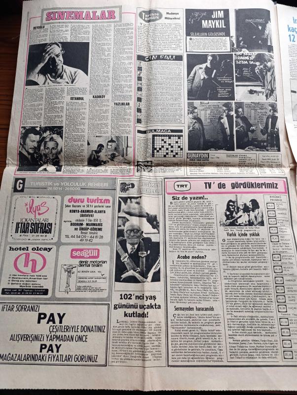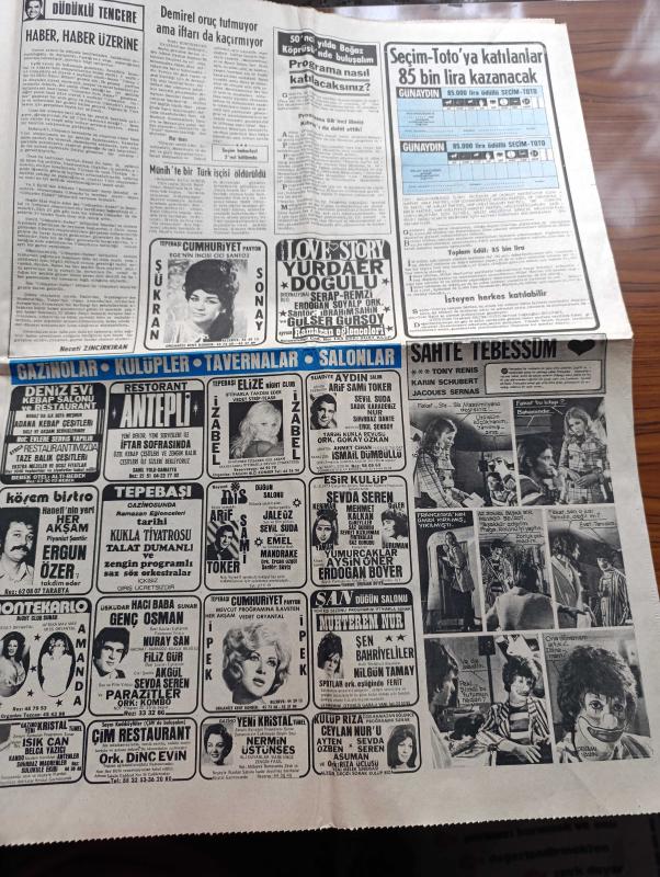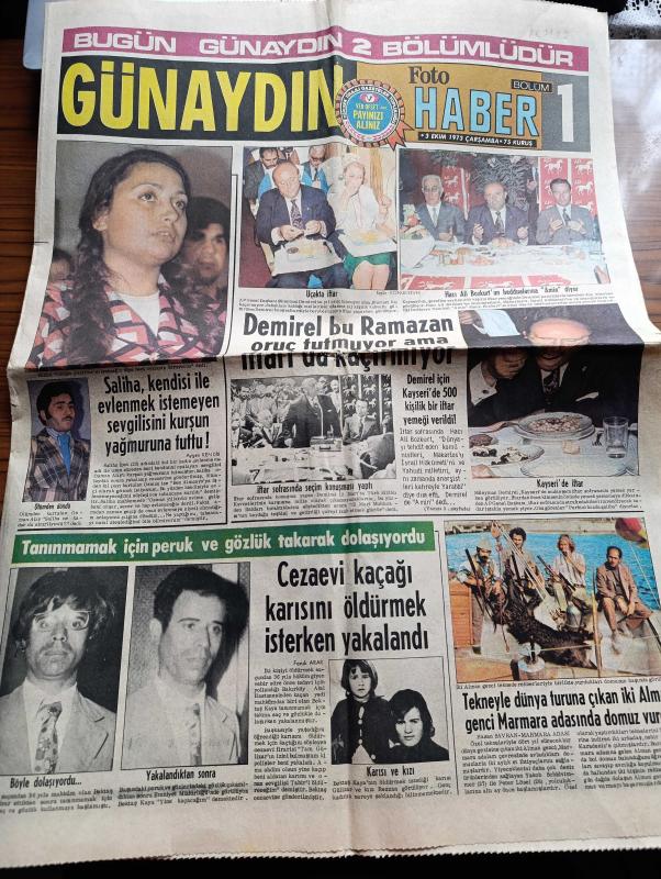 Günaydın Foto Haber Gazetesi - 3 Ekim 1973 - Süleyman Demirel Bu Ramazan Oruç Tutmuyor Ama İftarı Da Kaçırmıyor - Hacı Ali Bozkurt Komünistlere İsrail'e Makarios'a Beddua Ediyor Süleyman Demirel Amin Diyor - Cezaevi Kaçağı Bektaş Kaya Karısını Öldürmek İsterken Yakalandı - Sinema Programı - Jim Maykıl Silahların Gölgesinde Foto Roman - Kartal Tibet - Hale Soygazi - Cem Karaca Gökben Ve Tanju Okan Hafif Batı Müziği Programında Fotoğraf - Tv'de Gördüklerimiz - Azılı Bir Hırsız Nazif Özen Bayındırlık Bakanı Selahattin Babüroğlu'nun Evini Soyarken Yakalandı - Trakya'da Petrol Yatakları Bulundu - Şap Hastalığı İnsanlara Sıçradı - Fatih'in Fedaisi Kara Murat Yazan Rahmi Muratoğlu Çizen Abdullah Turhan - Con Amet Karikatür - Sahte Tebessüm Foto Roman - Seçim Toto'ya Katılanlar 85 Bin Lira Kazanacak - Uzay Yolu Güneş Asası Çizgi Roman - Galatasaray'dan Atletico Madrid Karşısında Zafer Bekliyor - Boksör Muhammed Ali Clay Ringten Sonra Sahnede de Dans Edecek - Büyük İslam Tarihi adlı eser, Kitap > Süreli Yayınlar > Gazeteler > Türkiye > Genel > Günlük kategorisinde İkinci El olarak satıştadır.