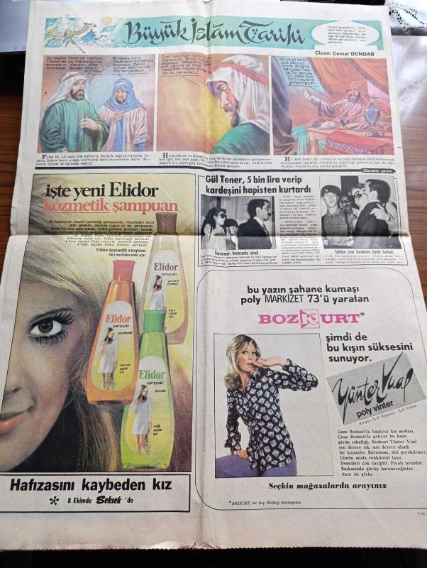 Günaydın Foto Haber Gazetesi - 3 Ekim 1973 - Süleyman Demirel Bu Ramazan Oruç Tutmuyor Ama İftarı Da Kaçırmıyor - Hacı Ali Bozkurt Komünistlere İsrail'e Makarios'a Beddua Ediyor Süleyman Demirel Amin Diyor - Cezaevi Kaçağı Bektaş Kaya Karısını Öldürmek İsterken Yakalandı - Sinema Programı - Jim Maykıl Silahların Gölgesinde Foto Roman - Kartal Tibet - Hale Soygazi - Cem Karaca Gökben Ve Tanju Okan Hafif Batı Müziği Programında Fotoğraf - Tv'de Gördüklerimiz - Azılı Bir Hırsız Nazif Özen Bayındırlık Bakanı Selahattin Babüroğlu'nun Evini Soyarken Yakalandı - Trakya'da Petrol Yatakları Bulundu - Şap Hastalığı İnsanlara Sıçradı - Fatih'in Fedaisi Kara Murat Yazan Rahmi Muratoğlu Çizen Abdullah Turhan - Con Amet Karikatür - Sahte Tebessüm Foto Roman - Seçim Toto'ya Katılanlar 85 Bin Lira Kazanacak - Uzay Yolu Güneş Asası Çizgi Roman - Galatasaray'dan Atletico Madrid Karşısında Zafer Bekliyor - Boksör Muhammed Ali Clay Ringten Sonra Sahnede de Dans Edecek - Büyük İslam Tarihi, Haldun Simavi tarafından kaleme alınmıştır. Günaydın Foto Haber Gazetesi - 3 Ekim 1973 - Süleyman Demirel Bu Ramazan Oruç Tutmuyor Ama İftarı Da Kaçırmıyor - Hacı Ali Bozkurt Komünistlere İsrail'e Makarios'a Beddua Ediyor Süleyman Demirel Amin Diyor - Cezaevi Kaçağı Bektaş Kaya Karısını Öldürmek İsterken Yakalandı - Sinema Programı - Jim Maykıl Silahların Gölgesinde Foto Roman - Kartal Tibet - Hale Soygazi - Cem Karaca Gökben Ve Tanju Okan Hafif Batı Müziği Programında Fotoğraf - Tv'de Gördüklerimiz - Azılı Bir Hırsız Nazif Özen Bayındırlık Bakanı Selahattin Babüroğlu'nun Evini Soyarken Yakalandı - Trakya'da Petrol Yatakları Bulundu - Şap Hastalığı İnsanlara Sıçradı - Fatih'in Fedaisi Kara Murat Yazan Rahmi Muratoğlu Çizen Abdullah Turhan - Con Amet Karikatür - Sahte Tebessüm Foto Roman - Seçim Toto'ya Katılanlar 85 Bin Lira Kazanacak - Uzay Yolu Güneş Asası Çizgi Roman - Galatasaray'dan Atletico Madrid Karşısında Zafer Bekliyor - Boksör Muhammed Ali Clay Ringten Sonra Sahnede de Dans Edecek - Büyük İslam Tarihi adlı eser Türkçe dilindedir.