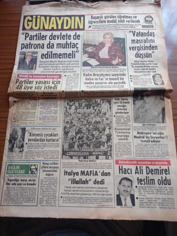 Günaydın Gazetesi - 13 Şubat 1983 - Fenerbahçeli Efe İlk Kez Eski Takımı Eczacıbaşına Karşı Oynuyor - Galatasaray İskenderunspor Maçı - Zeki Alasya - Metin Akpınar - İtalya Mafia'dan illallah Dedi - Hacı Ali Demirel Teslim Oldu - Partiler Yasası İçin 48 Üye Söz istedi - Kıbrıs Türk Federe Devleti - Sadi Irmak - Koramiral Doğan Toktamış Toprağa Verildi adlı eser, Kitap > Süreli Yayınlar > Gazeteler kategorisinde İkinci El olarak satıştadır.