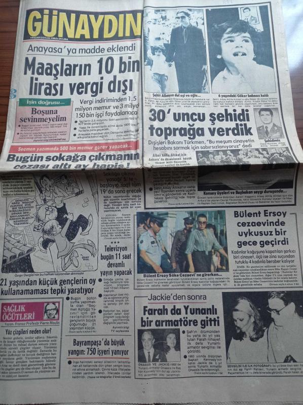 Günaydın Gazetesi 5 Eylül 1982- Kaçaklar Galatasaray'la Pazarlık Yapıyor - Beşiktaş'ta Koltuk Kavgası - Süleyman Seba - Mustafa Topaloğlu - Ermeni Teröristlerce Öldürülen Askeri Ataşemiz Albay Atilla Altıkat - Farah Pehlevi De Yunanlı Bir Armatöre Gitti - Bugün Sokağa Çıkmanın Cezası 6 Ay Hapis adlı eser, Kitap > Süreli Yayınlar > Gazeteler kategorisinde İkinci El olarak satıştadır.