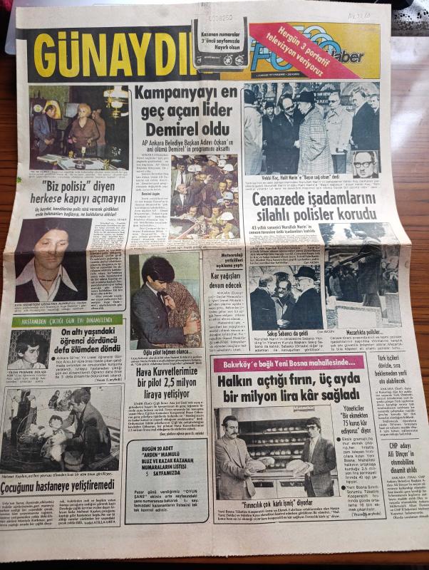 Günaydın Gazetesi - 8 Aralık 1977 - Türkiye'nin En Eski Sanayicilerinden Nurullah Narin'in Cenazesine Vehbi Koç Geldi Fotoğraf - Kampanyayı En Geç Açan Lider Süleyman Demirel Oldu - Nurullah Narin'in Cenazesinde İşadamlarını Silahlı Polisler Korudu - Bakırköy'e Bağlı Yenibosna Mahallesi'nde Halkın Açtığı Fırın Üç Ayda Bir Milyon Lira Kar Sağladı - Hafiyesi Mahmut Karikatür - Trafik Sıkışıklığını Önlemek İçin Küçükçekmece Köprüsünün Yanına Bir Köprü Daha Yapılıyor - Eurovision Yarışmasının Finalistleri Belli Oldu - Nükhet Duru'nun Söylediği 4 Şarkının 2 si Finale Kaldı Fotoğraf - Serpil Barlas Finalde - Melike Demirağ - Kuzeyin Refah Ülkesi Danimarka'da Türkler Röportaj Gündüz Serdengeçti Yazı Dizisi - Güzin Abla Köşesi - Teklif Ediyoruz Eurovision Şarkısını Halk Seçsin - Orkestra Şefi Timur Selçuk'la Fotoğraf - Genç Şantöz Jale Sözen Pilotlara Konser Verdi Fotoğraf - Konya'da Et Balık Kurumu Mağazaları Önünde Uzun Kuyruklar- TV Yıldızlarını Seçiyoruz - Halit Kıvanç - Bedia Akartürk adlı eser, Kitap > Süreli Yayınlar > Gazeteler > Türkiye > Genel > Günlük kategorisinde İkinci El olarak satıştadır.