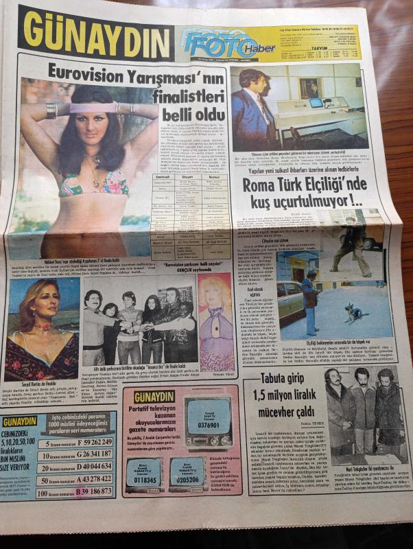 Günaydın Gazetesi - 8 Aralık 1977 - Türkiye'nin En Eski Sanayicilerinden Nurullah Narin'in Cenazesine Vehbi Koç Geldi Fotoğraf - Kampanyayı En Geç Açan Lider Süleyman Demirel Oldu - Nurullah Narin'in Cenazesinde İşadamlarını Silahlı Polisler Korudu - Bakırköy'e Bağlı Yenibosna Mahallesi'nde Halkın Açtığı Fırın Üç Ayda Bir Milyon Lira Kar Sağladı - Hafiyesi Mahmut Karikatür - Trafik Sıkışıklığını Önlemek İçin Küçükçekmece Köprüsünün Yanına Bir Köprü Daha Yapılıyor - Eurovision Yarışmasının Finalistleri Belli Oldu - Nükhet Duru'nun Söylediği 4 Şarkının 2 si Finale Kaldı Fotoğraf - Serpil Barlas Finalde - Melike Demirağ - Kuzeyin Refah Ülkesi Danimarka'da Türkler Röportaj Gündüz Serdengeçti Yazı Dizisi - Güzin Abla Köşesi - Teklif Ediyoruz Eurovision Şarkısını Halk Seçsin - Orkestra Şefi Timur Selçuk'la Fotoğraf - Genç Şantöz Jale Sözen Pilotlara Konser Verdi Fotoğraf - Konya'da Et Balık Kurumu Mağazaları Önünde Uzun Kuyruklar- TV Yıldızlarını Seçiyoruz - Halit Kıvanç - Bedia Akartürk, Haldun Simavi tarafından kaleme alınmıştır. Günaydın Gazetesi - 8 Aralık 1977 - Türkiye'nin En Eski Sanayicilerinden Nurullah Narin'in Cenazesine Vehbi Koç Geldi Fotoğraf - Kampanyayı En Geç Açan Lider Süleyman Demirel Oldu - Nurullah Narin'in Cenazesinde İşadamlarını Silahlı Polisler Korudu - Bakırköy'e Bağlı Yenibosna Mahallesi'nde Halkın Açtığı Fırın Üç Ayda Bir Milyon Lira Kar Sağladı - Hafiyesi Mahmut Karikatür - Trafik Sıkışıklığını Önlemek İçin Küçükçekmece Köprüsünün Yanına Bir Köprü Daha Yapılıyor - Eurovision Yarışmasının Finalistleri Belli Oldu - Nükhet Duru'nun Söylediği 4 Şarkının 2 si Finale Kaldı Fotoğraf - Serpil Barlas Finalde - Melike Demirağ - Kuzeyin Refah Ülkesi Danimarka'da Türkler Röportaj Gündüz Serdengeçti Yazı Dizisi - Güzin Abla Köşesi - Teklif Ediyoruz Eurovision Şarkısını Halk Seçsin - Orkestra Şefi Timur Selçuk'la Fotoğraf - Genç Şantöz Jale Sözen Pilotlara Konser Verdi Fotoğraf - Konya'da Et Balık Kurumu Mağazaları Önünde Uzun Kuyruklar- TV Yıldızlarını Seçiyoruz - Halit Kıvanç - Bedia Akartürk adlı eser Türkçe dilindedir.