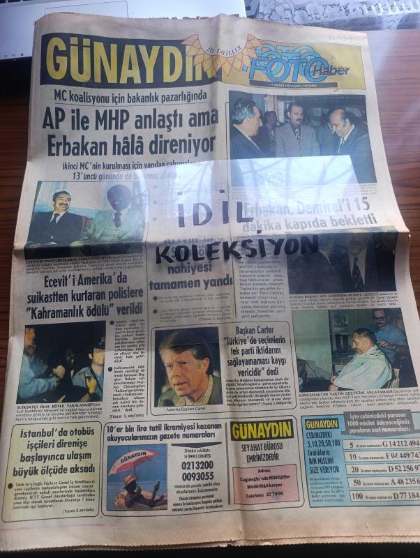 Günaydın Gazetesi - Turkish Newspaper - 17 Temmuz 1977 - MC koalisyonu için bakanlık pazarlığında - AP ile MHP anlaştı ama Erbakan hala direniyor - CHP Genel Başkanı Bülent Ecevit kendisini suikasttan kurtaran Amerikan polislerini Türkiye'ye davet etti Fotoğrafı - Ecevit'i Amerika'da suikasttan kurtaran polislere kahramanlık ödülü verildi - Necmettin Erbakan Süleyman Demirel 15 dakika kapıda bekletti Fotoğrafı - Amerika başkanı Carter Türkiye'de seçimlerin tek Parti iktidarı sağlayamaması kaygı vericidir diyor - Artvin'in Sarıgöl nahiyesi tamamen yandı - direniş sebebiyle İstanbul'da dün belediye otobüsleri çalışmadı - Aksaray'daki TÖB DER binasına bomba atıldı fotoğraf - Jean Paul Belmondo'nun oğlu boyuna yaklaştı Fotoğrafı - Fatih'in Fedaisi Kara Murat yazan Rahmi Muratoğlu Çizen Abdullah Turhan - tarafsız bir Türk gazetecisinin kalem ve objektifinden röportaj Aydın Öztürk - Nil Burak defile mi yapacak şarkı mı söyleyecek Fotoğrafı - Dizi Film MC Millan saat 20.40'da televizyonda adlı eser, Kitap > Süreli Yayınlar > Gazeteler > Türkiye > Genel > Günlük kategorisinde İkinci El olarak satıştadır.