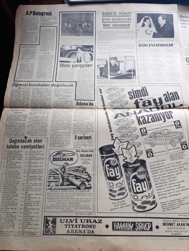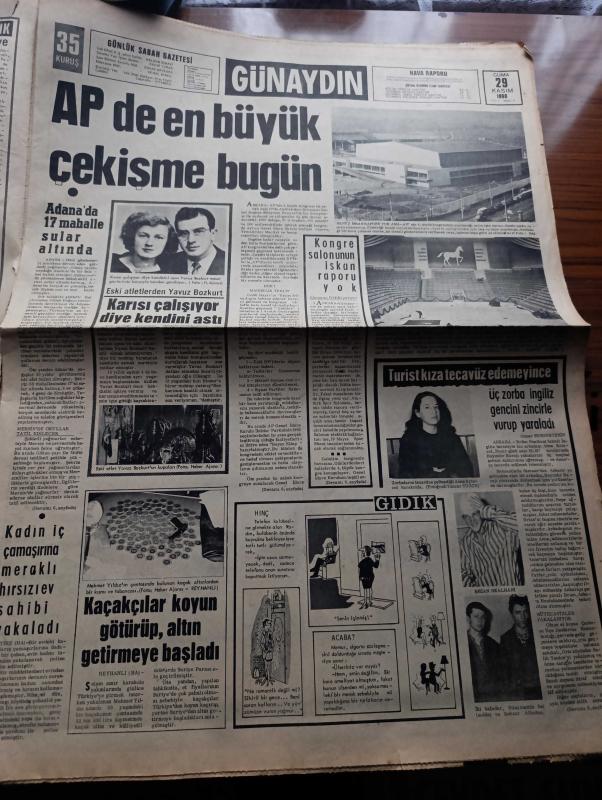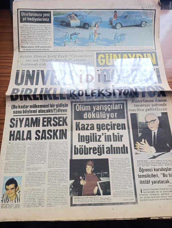Günaydın Gazetesi - Turkish Newspaper - 29 Kasım 1968 - Üniversite öğrenci birlikleri dağıtılıyor - rektör Ekrem Şerif Egeli öğrencileri bir tek büyük kuruluş altında toplamak çok faydalı olacaktır dedi fotoğraf - öğrenci kuruluşlarının temsilcileri bu büyük ihtilaf yaratacak dediler - kapak kızı oto yarışçısı Rosemary Smith Fotoğrafı - Siyami Ersek hala şaşkın - İstanbul sinema programı - Az gittik uz gittik yazan Aziz Nesin - Adalet Partisinde en büyük çekişme bugün - Jim Maykıl ölümlerden ölüm beğen Foto Roman - meşhurların sabah kahvaltısı - sabah saat 6.00'da uyanan Türkan Şoray'ın ilk işi biraz kahvaltı biraz makyaj Fotoğrafı - Pirelli - dünya şampiyonu Sırrı Acar ceza kuruluna veriliyor - ünlü bisikletçi Nenco Türkiye'ye geliyor - hacettepeli futbolcular kazan kaldırdılar - dağıtılacak olan talebe cemiyetleri listesi - Avrupa şampiyon kulüpler Kupası rövanş maçında Fenerbahçe elendi Fotoğrafı - Ajax'ın büyük ümidi Cruyff İstanbul pavyonlarında eğlendi Fotoğrafı - Metin Oktay adlı eser, Kitap > Süreli Yayınlar > Gazeteler > Türkiye > Genel > Günlük kategorisinde İkinci El olarak satıştadır.