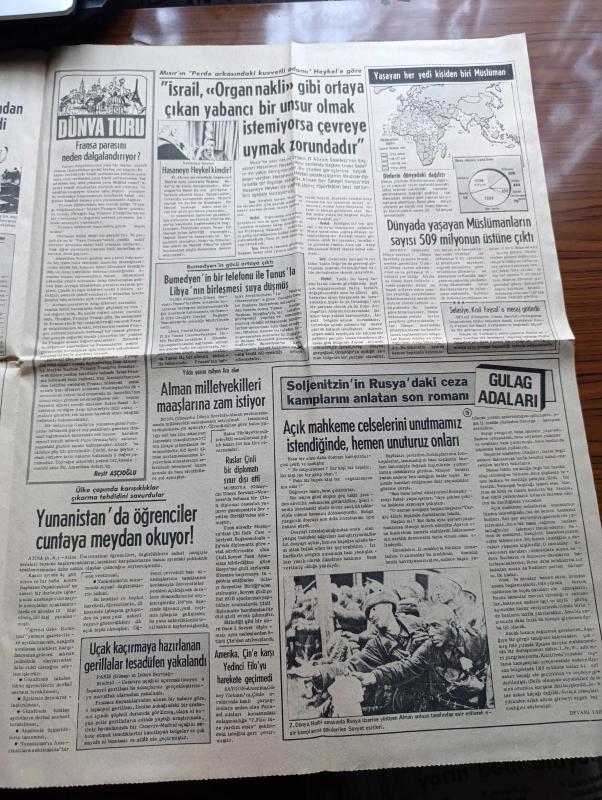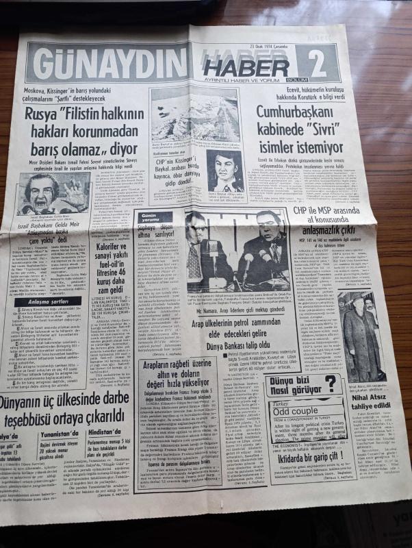Günaydın Haber 2 Gazetesi - 23 Ocak 1974 - Nihal Atsız Tahliye Edildi - CHP'nin Kissinger'i Deniz Baykal Arabası Buzda Kayınca Öbür Dünyaya Gidip Döndü - Rusya Filistin Halkının Hakları Korunmadan Barış Olamaz Diyor - Cumhurbaşkanı Fahri Korutürk Kabinede Sivri İsimler İstemiyor - Dünya Bankası Başkanı Robert McNamara Arap Liderlere Gizli Mektup Gönderdi - Cumhuriyet Halk Partisi Ve Milli Selamet Partisi Arasında Af Konusunda Anlaşmazlık Çıktı - İsrail Başbakanı Golda Meir Anlaşmadan Başka Çare Yoktu Dedi - Dünyanın Üç Ülkesinde ( İtalya Yunanistan Hindistan) Darbe Teşebbüsü Ortaya Çıkarıldı - 72 Dilden Dünya Basını Ne Diyor - Maden İşçileri Fransa'da da Greve Başladı - 06 Ankara Örsan Öymen Yazıyor - Yaşayan Her Yedi Kişiden Biri Müslüman - Soljenitzin'in Rusya'daki Ceza Kamplarını Anlatan Son Romanı Gulag Adaları Yazı Dizisi - Yunanistan'da Öğrenciler Cuntaya Meydan Okuyor - Fransa'da Sosyalist Parti Ve İktidar Sorunu - Uranyum Gerillaların Eline Geçerse Kolayca Atom Bombası Yapar adlı eser, Kitap > Süreli Yayınlar > Gazeteler > Türkiye > Genel > Günlük kategorisinde İkinci El olarak satıştadır.