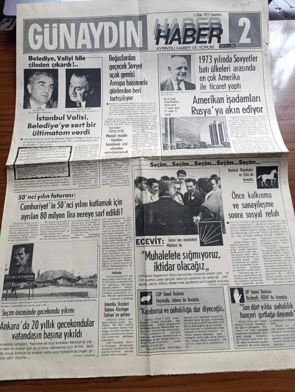 Günaydın Haber 2 Gazetesi - 6 Ekim 1973 - İstanbul Valisi Namık Kemal Şentürk Belediyeye Sert Bir Ültimatom Verdi - Boğazlardan Geçecek Sovyet Uçak Gemisi Avrupa Basınında Günlerden Beri Tartışılıyor - 1973 Yılında Sovyetler Batı Ülkeleri Arasında En Çok Amerika İle Ticaret Yaptı - Seçim Haberleri - Süleyman Demirel Diyarbakır Ve Urfa'da Konuştu - Bülent Ecevit İsmet İnönü'nün Memleketi Malatya'da - Amerikan Dışişleri Bakanı Henry Kissinger Türkiye'ye Geliyor - Cumhuriyetin 50. Yılını Kutlamak İçin Ayrılan 80 Milyon Lira Nereye Sarf Edildi - 72 Dilden Dünya Basını Ne Diyor - Ege Sanayi Odası Başkanı Şinasi Ertan - Petrol İş Grevi 9 Ekim'de Başlıyor - Kızıl Çin'le Sovyet Rusya Arasında Bir Yumuşama Yok - Amerikan Başkanı Nixon Kongrenin Sovyetler'e Ticari İmtiyaz Hakkı Tanıması Konusunda Israr Ediyor - El Fetih Ürdün'ün Teklifini Reddetti - Vietnam'da Ateşkesten Bu Yana 46 Bin Kişi Öldü - 06 Ankara Örsan Öymen Yazıyor - İsmet İnönü'nün Seçim Falı Süleyman Demirel Tek Başına İktidara, Haldun Simavi tarafından kaleme alınmıştır. Günaydın Haber 2 Gazetesi - 6 Ekim 1973 - İstanbul Valisi Namık Kemal Şentürk Belediyeye Sert Bir Ültimatom Verdi - Boğazlardan Geçecek Sovyet Uçak Gemisi Avrupa Basınında Günlerden Beri Tartışılıyor - 1973 Yılında Sovyetler Batı Ülkeleri Arasında En Çok Amerika İle Ticaret Yaptı - Seçim Haberleri - Süleyman Demirel Diyarbakır Ve Urfa'da Konuştu - Bülent Ecevit İsmet İnönü'nün Memleketi Malatya'da - Amerikan Dışişleri Bakanı Henry Kissinger Türkiye'ye Geliyor - Cumhuriyetin 50. Yılını Kutlamak İçin Ayrılan 80 Milyon Lira Nereye Sarf Edildi - 72 Dilden Dünya Basını Ne Diyor - Ege Sanayi Odası Başkanı Şinasi Ertan - Petrol İş Grevi 9 Ekim'de Başlıyor - Kızıl Çin'le Sovyet Rusya Arasında Bir Yumuşama Yok - Amerikan Başkanı Nixon Kongrenin Sovyetler'e Ticari İmtiyaz Hakkı Tanıması Konusunda Israr Ediyor - El Fetih Ürdün'ün Teklifini Reddetti - Vietnam'da Ateşkesten Bu Yana 46 Bin Kişi Öldü - 06 Ankara Örsan Öymen Yazıyor - İsmet İnönü'nün Seçim Falı Süleyman Demirel Tek Başına İktidara adlı eser Türkçe dilindedir.