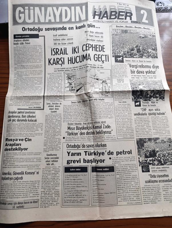 Günaydın Haber 2 Gazetesi - 9 Ekim 1973 - İsrail İki Cephede Karşı Hücuma Geçti - Ortadoğu Savaşı'nda En Kanlı Gün - İsrail Yedeklerini Toplayıp Asker Sayısını 300 Bin Kişiye Çıkardı - Mısır Doğu Yakasında 11 Köprü Başını Ele Geçirdiğini Söyledi - Seçim Haberleri - Süleyman Demirel Afyon Ve Konya'da Konuştu - Turhan Feyzioğlu Karşımızdaki Parti Yeni CHP Değil Yeni TİP'tir Dedi - Bülent Ecevit Ordu Siyasetten Uzaklaşma Arzusundadır Dedi - Rusya Ve Çin Arapları Destekliyor- Mısır Büyükelçisi Kemal Zade Türkiye'den Destek Bekliyoruz - Ortadoğu'da Savaş Olurken Yarın Türkiye'de Petrol Grevi Başlıyor - DİSK Genel Başkanı Kemal Türkler Hükümeti Grev Kırıcılığı Yapmakla Suçladı - Dünya Turu Yazan Reşit Aşçıoğlu Köşe Yazısı - Makarios'a Yapılan Suikastten Sonra Kıbrıs'ta İnsan Avı Başladı - Komünist Çin Fantom Tipi Savaş Uçağı Yapmak İstiyor - Şili'de Allende Taraftarları Ordu Birlikleri İle Çarpışıyor - 06 Ankara Örsan Öymen Yazıyor - Bir Vatandaş Turhan Feyzioğlu'na Hülya Koçyiğit'i Sordu adlı eser, Kitap > Süreli Yayınlar > Gazeteler > Türkiye > Genel > Günlük kategorisinde İkinci El olarak satıştadır.