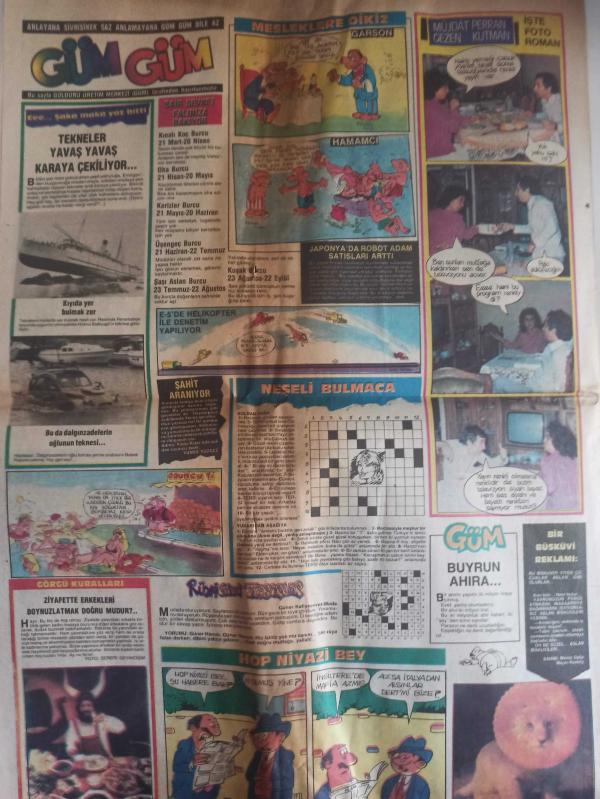 Güneş 2 Magazin Gazetesi - 14 Eylül 1982 - Tenis İmparatorunun Rüya Gibi Yaşamı - Karaoğlan Çizgi Romanı - Suat Yalaz - Tarihi İstanbul Kurtarılmalı - Picasso'nun Köylüsü Picasso'yu Çiziyor - Azra Erhan - Çocuklarda Okuma, Öğrenme Güçlüğü - Selçuk Erez - Çocuğunuzun Şaşılığı Sizi zmesin - Karadeniz Koroner Bakım Ünitesine Kavuştu - Başak Burcunun Özellikleri - Doğum Kontrol Hapları Deride Lekeler Oluşturuyor - İlkokul Öğretmenlerimiz - Nezihe Araz - Şeytan Şatosu - Oyun Bitti Fotoromanı - Sibel Savacı - Görkem Ürgüplü - 25. Yüzyıl - Dedektif Corrigan - Cisco Kid - Süpermen - Latigo - Boncuk - Miki Fare - Temel Resi - Tom ve Jerry Çizgi Romanları - Genç Kızlar Fotoromanı - Engin Çağlar - Güm Güm - Mesleklere Dikiz - Müjdat Gezen - Perran Kutman - Hop Niyazi Bey Neşeli Bulmaca fotoğraf ve haberi - Tam Takım Gazete adlı eser, Kitap > Süreli Yayınlar > Gazeteler > Dünya > Haftalık kategorisinde İkinci El olarak satıştadır.