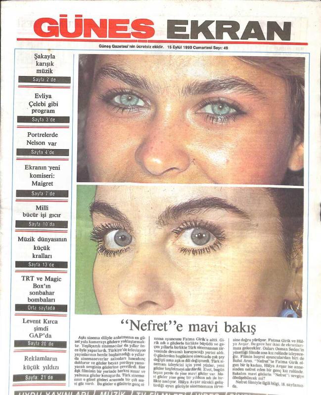 Güneş Gazetesi Ekran Eki 15 Eylül 1990 - Fatma Girik Hülya Avşar Nefret'e Mavi Bakış - Aydan Şener Katil Oldu GZ137495, en son 18 gün önce güncellenmiştir.