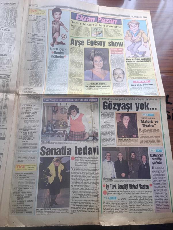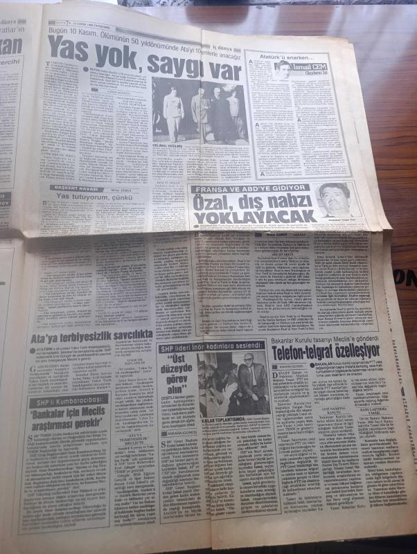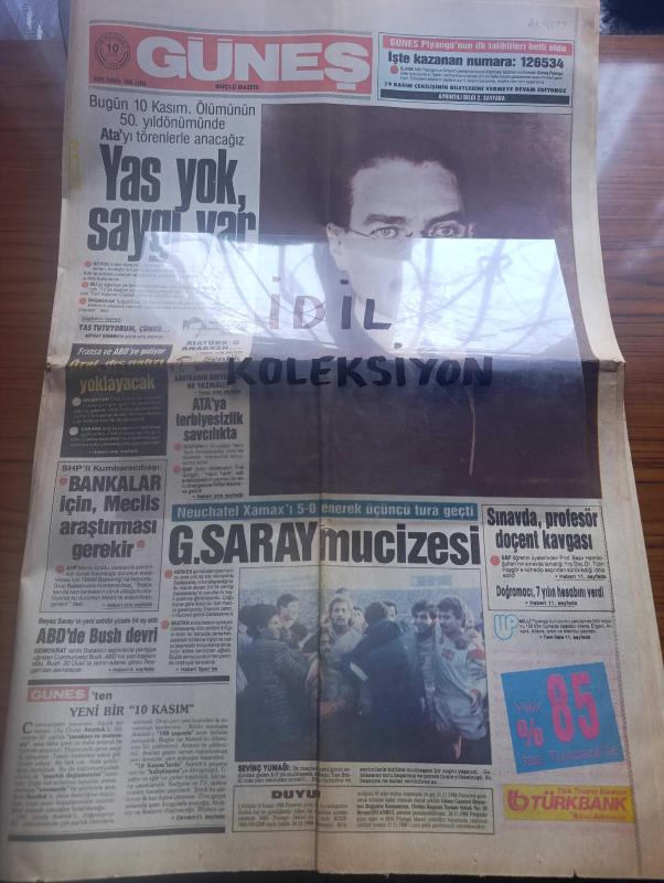 Güneş Gazetesi - Turkish Newspaper - 10 Kasım 1988 - Bugün 10 Kasım ölümünün 50. Yıldönümünde Atatürk'ü törenlerle alacağız Fotoğrafı - Atatürk'ü anarken Yazan İsmail Cem - Turgut Özal Fransa ve ABD'ye gidiyor - Neuchatel Xamax'ı 5-0 yenerek üçüncü tura geçen Galatasaray - Tanju Çolak ve kaptan Cüneyt Tanman omuzlarda Fotoğrafı - ABD'de Bush devri - Miki Fare Keloğlan Sevimli Yunus Flipper ve İstanbul çocukları tarabya'da buluşacaklar - halk ödülü Yaşar Kemal'in - bilgisayar aşısı geldi - bilgisayarda sisteme bulaşan virüs nasıl yayılmaya başlar - Nejat Uygur hastane mi kestane mi - kemalizm ve Atatürkçülük inceleme Erol Toy Yazı Dizisi - Nil Burak Mehtap Ar kulübünüz Süreyya'da - uygulamalı sürücü Okulu açıldı - ANAP Genel Başkan yardımcısı Recep Erguna suikastin kilit adamı İmdat Halis yakalandı - Sakaryaspor güçlü rakibi Frankfurt karşısında varlık gösteremedi Fotoğrafı - tutuklu annesi Hanım Sönmez kendini yaktı Fotoğrafı - mahkum Hasan Arı'ya Kenan Evren'den af - Suna Pekuysal adlı eser, Kitap > Süreli Yayınlar > Gazeteler > Türkiye > Genel > Günlük kategorisinde İkinci El olarak satıştadır.