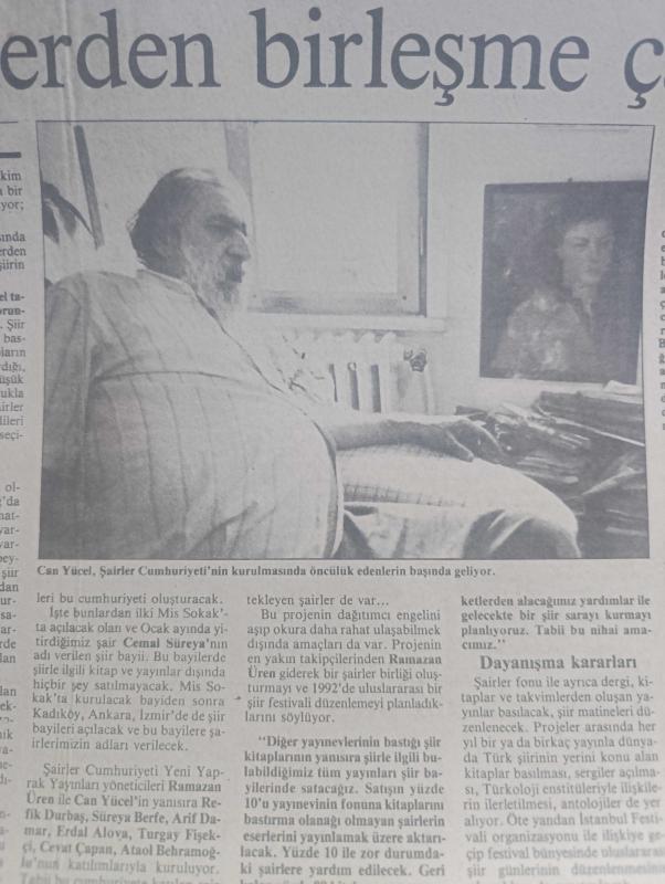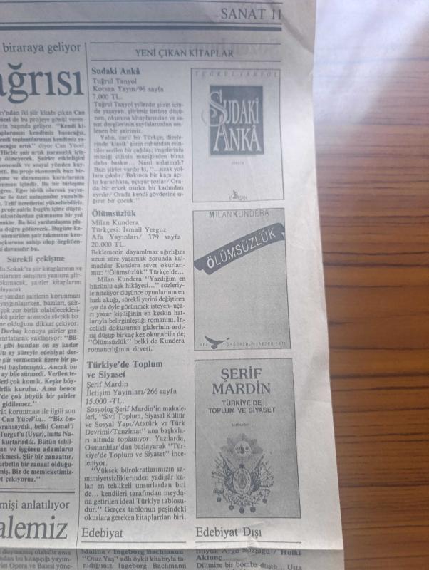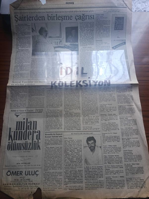Güneş Gazetesi - Turkish Newspaper - 22 Ekim 1990 - şairlerden birleşme çağrısı - Can Yücel şairler Cumhuriyeti'nin kurulmasında öncülük edenlerin başında geliyor fotoğraf - Orta çağda şairler- Mis sokakta açılacak olan ve Ocak ayında yitirdiğimiz şair Cemal Süreyya'nın adı verilen şiir bayii - yeni çıkan kitaplar - Sudaki Anka yazan Tuğrul Tanyol - ölümsüzlük yazan Milan Kundera - Türkiye'de toplum ve siyaset yazan Şerif Mardin - belgelerle Opera ve Balemiz yazan Jak Deleon - sosyal yayınlarda imza ve söyleşi günleri - bu hafta ne okudular - Alev Sezer bugünlerde Richard Bach'ın Bir ve Bekir Yıldız'ın darbe adlı kitaplarını okuyor - Brunello İle Somezi konser salonunda - Cemal Reşit Rey - darbelerin ekonomisi kitabı yazan Mehmet Altan - yüreğimin Orta yeri sinema yazan Atilla Dorsay - Cam Fanusun altında yazan Ananis Nin - Başbakan Yıldırım Akbulut terörün islamisi olmaz - bölge bakanlar havaya girdi - İstanbul büyükşehir Belediye Başkanı Nurettin Sözen bombayı patlattı, Asil Nadir tarafından kaleme alınmıştır. Güneş Gazetesi - Turkish Newspaper - 22 Ekim 1990 - şairlerden birleşme çağrısı - Can Yücel şairler Cumhuriyeti'nin kurulmasında öncülük edenlerin başında geliyor fotoğraf - Orta çağda şairler- Mis sokakta açılacak olan ve Ocak ayında yitirdiğimiz şair Cemal Süreyya'nın adı verilen şiir bayii - yeni çıkan kitaplar - Sudaki Anka yazan Tuğrul Tanyol - ölümsüzlük yazan Milan Kundera - Türkiye'de toplum ve siyaset yazan Şerif Mardin - belgelerle Opera ve Balemiz yazan Jak Deleon - sosyal yayınlarda imza ve söyleşi günleri - bu hafta ne okudular - Alev Sezer bugünlerde Richard Bach'ın Bir ve Bekir Yıldız'ın darbe adlı kitaplarını okuyor - Brunello İle Somezi konser salonunda - Cemal Reşit Rey - darbelerin ekonomisi kitabı yazan Mehmet Altan - yüreğimin Orta yeri sinema yazan Atilla Dorsay - Cam Fanusun altında yazan Ananis Nin - Başbakan Yıldırım Akbulut terörün islamisi olmaz - bölge bakanlar havaya girdi - İstanbul büyükşehir Belediye Başkanı Nurettin Sözen bombayı patlattı adlı eser Türkçe dilindedir.