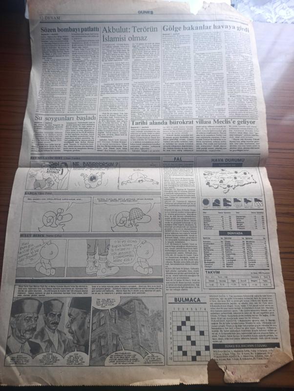Güneş Gazetesi - Turkish Newspaper - 22 Ekim 1990 - şairlerden birleşme çağrısı - Can Yücel şairler Cumhuriyeti'nin kurulmasında öncülük edenlerin başında geliyor fotoğraf - Orta çağda şairler- Mis sokakta açılacak olan ve Ocak ayında yitirdiğimiz şair Cemal Süreyya'nın adı verilen şiir bayii - yeni çıkan kitaplar - Sudaki Anka yazan Tuğrul Tanyol - ölümsüzlük yazan Milan Kundera - Türkiye'de toplum ve siyaset yazan Şerif Mardin - belgelerle Opera ve Balemiz yazan Jak Deleon - sosyal yayınlarda imza ve söyleşi günleri - bu hafta ne okudular - Alev Sezer bugünlerde Richard Bach'ın Bir ve Bekir Yıldız'ın darbe adlı kitaplarını okuyor - Brunello İle Somezi konser salonunda - Cemal Reşit Rey - darbelerin ekonomisi kitabı yazan Mehmet Altan - yüreğimin Orta yeri sinema yazan Atilla Dorsay - Cam Fanusun altında yazan Ananis Nin - Başbakan Yıldırım Akbulut terörün islamisi olmaz - bölge bakanlar havaya girdi - İstanbul büyükşehir Belediye Başkanı Nurettin Sözen bombayı patlattı adlı eser, Kitap > Süreli Yayınlar > Gazeteler > Türkiye > Genel > Günlük kategorisinde İkinci El olarak satıştadır.