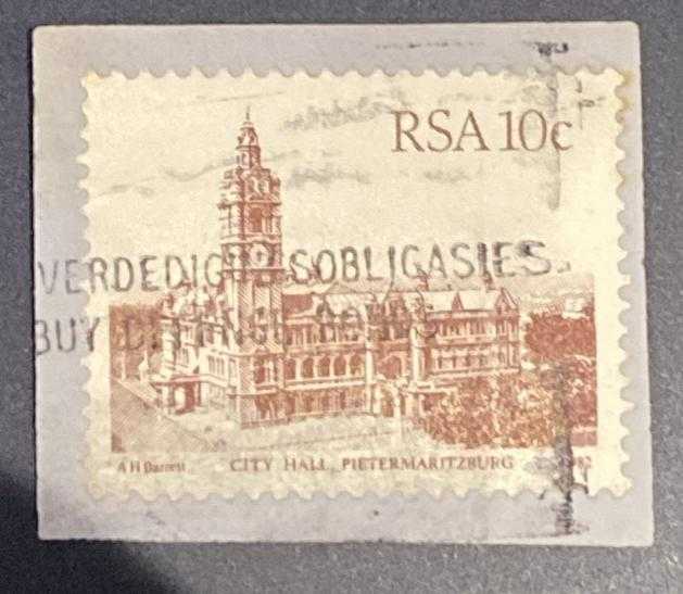 Güney Afrika Pulu - South Africa Stamp - Mektup Zarfından Kesilmiş / Postadan Geçmiş Pul Filateli - Damgalı - Pietermaritzburg Belediye Binası Temalı Pul , 1982, 10 PARA - YABANCI PULLAR-NOSTALJİK DOĞUM GÜNÜ HEDİYESİ
