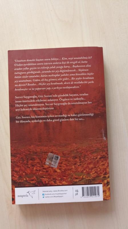 Güz Sonrası, Servet Saygınoğlu tarafından kaleme alınmıştır. Kitap 2014 yılında Müptela tarafından [İstanbul] 9786059021074 ISBN kodu ile yayınlanmıştır. Satışta olan kitap, yayınevinin 1. baskısıdır. 277 sayfadır. Güz Sonrası adlı eser Türkçe dilindedir.