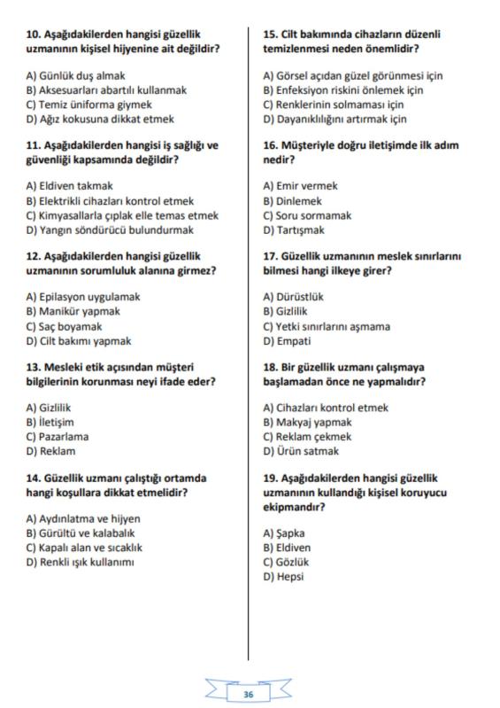 Güzellik Uzmanlığı Hazırlık Kitapları – Tüm Sınavlar İçin Kapsamlı Kaynak! Ustalık, Kalfalık, MYK ve MEB Güzellik Uzmanlığı Sınavlarına hazırlanmak isteyen herkes için eksiksiz bir rehberdir. Bu kitap, alanında uzman eğitmenler tarafından hazırlanmış olup hem teorik bilgiyi hem de uygulama temelli sınav sorularını kapsamaktadır. Kitap Özellikleri: Renkli ve detaylı Konu Anlatımı Sınavlarda sıkça çıkan ve çıkabilecek Binlerce Soru Çıkmış Sorular ve Yeni Nesil Soru Tipleri Gerçek sınav formatında hazırlanmış Deneme Sınavları Öğrenmeyi pekiştiren farklı soru türleri: Test Soruları Boşluk Doldurma Doğru – Yanlış Soru – Cevap (Açıklamalı) Kapsadığı Konular: • Cilt Bakımı ve Cilt Tipleri • Epilasyon ve Depilasyon • Makyaj Teknikleri • El ve Ayak Bakımı • Saç ve Cilt Anatomisi • Hijyen, Dezenfeksiyon ve Salon Yönetimi • Kozmetik Ürün Bilgisi Avantajları: • Renkli sayfalarla sıkılmadan öğrenme • Gerçek sınavlara birebir uyumlu içerik • Kendi kendine öğrenim için ideal yapı • Ustalık, Kalfalık ve MYK belgeleri için mükemmel hazırlık desteği Sonuç: Güzellik alanında kariyer hedefleyen herkes için hazırlanmış, binlerce soruluk dev bir kaynak! Bu kitapla sınavlarda fark yaratın ve hedefinize emin adımlarla ilerleyin.