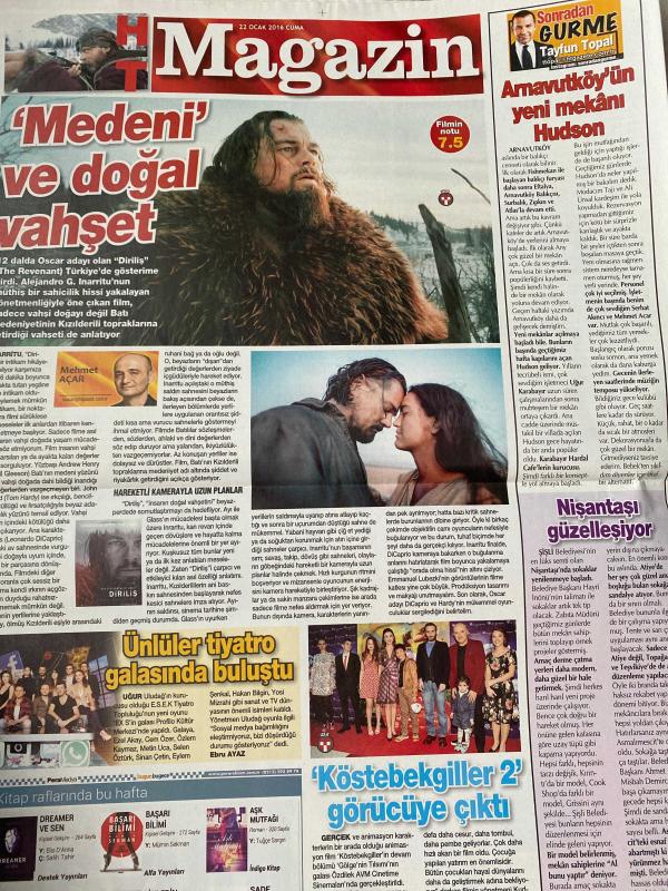 HABERTÜRK MAGAZİN GAZETESİ DOĞUM GÜNÜ HEDİYESİ- 22 OCAK 2016 -Hüseyin Turan-Efsin Öven-Esin Övet-Ayşegül-Hande Ataizi-Yonca Evcimik-Hakan Sabancı-Aslışah Alkoçlar-Burcu Esmersoy-Nursan Tuna-Cengiz Bozkurt-Serkan Öztürk-Ozan Baran-Süreyya Yalçın-Mustafa Koç-Rafet El Roman-Ata Demirer-Mert Fırat-Erdem Yener-Doğa Rutkay-Serdar Kızık-Hülya Süslü-Alper Kul-Yılmaz Erdoğan-Ezgi Mola-Ali Sunal-Murat Eken-Onur Atilla-Özlem Türkad-Hande Yener-Serdar Kızık-Bade İşçil-Serdar Kızık-Serdar Kızık-Serdar Kızık-Eren Fransız-Selen Soyder-Mustafa Keser-Suat Kılıçkaya-Selçuk Basa-Ajda Pekkan-Burcu Esin-Can Temiz-Doğan Şentürk-İlter Özfırat-Cem Cemal Özfırat-Gen. Kenan Kıraç-Rahmi Koç-Emine Sabancı Kamışlı-Demet Sabancı Çetindoğan-Cemil İpekçi-Ayşen Zaimoğlu-Harun Zaimoğlu-Özge Zaimoğlu-Buket Eczacıbaşı-Bülent Eczacıbaşı-Hayati Özseçkin-Rauf Dirikoç-Mehmet Açar-Tayfun Topal-Zeynep Özdemir-Ali Yünetici-Ender Merter-Kaan Tangöze-Tanem Sivar-Gül Gölge Saygı-Leonardo DiCaprio-Alejandro G. Iñárritu-Gökçe Kırgız adlı eser Türkçe dilindedir. Eserin içeriğinde Türkçe dilinde bölümlere de yer verilmektedir.