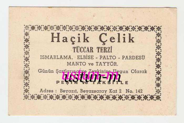 ** HAÇİK ÇELİK / TÜCCAR TERZİ ESKİ İŞYERİ KARTI ** Arkası yazısız,çok temiz durumda,eski işyeri kartı...