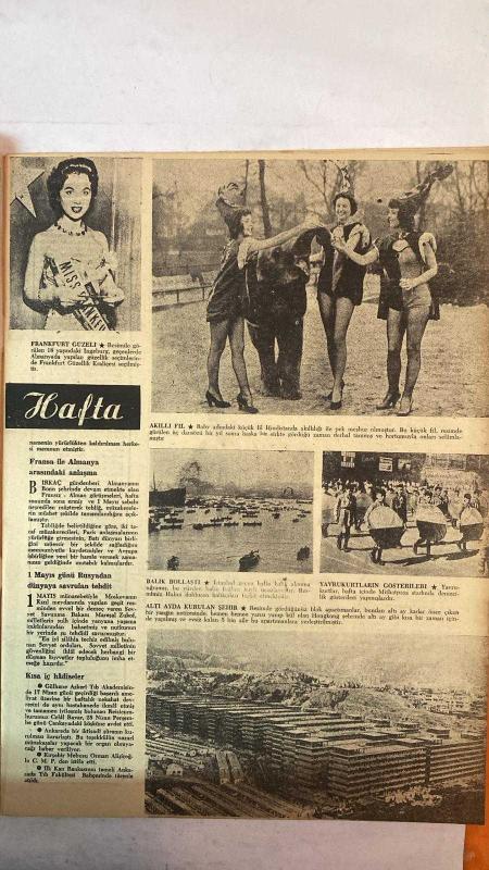 HAFTA DERGİSİ - KAPAK: YVONNE DE CARLO - 6 MAYIS 1955 — SAYI: 18 INGEBURG - MAREŞAL ZUKOF - CELAL BAYAR - OSMAN ALİŞİROĞLU - BABY (FİL) - GENERAL D. C. SPRY - PROF. GÖKAY - ADNAN MENDERES - MR. DAYTON - AVRA WARREN MISS ANKE FRANKFURT GÜZELİ - FRANSA İLE ALMANYA ARASINDAKİ ANLAŞMA - MOSKOVA’DAN DÜNYAYA SAVRULAN TEHDİT - KISA İÇ HÂDİSELER - AKILLI FİL - BALIK BOLLASTI - YAVRUKURTLARIN GÖSTERİLERİ - ALTI AYDA KURULAN ŞEHİR - TÜRKİYE KÖYLÜ PARTİSİNİN TOPLANTISI - ANZAK GÜNÜ - DÜNYA İZCİ TEŞKİLATI REİSİ ŞEHRİMİZDE - ASKERİ TATBİKAT - IRAK PARLAMENTO HEYETİNİN ZİYARETLERİ - YENİ CAMİ’NİN TAMİRİ BİTİYOR - AMERİKANIN BİZE TAKINDIĞI YENİ TAVIR - BEDELSİZ MAL İTHALİNE DAİR KARARNAME İPTAL EDİLDİ - TAM TAKIM EKSİKSİZ 34 SAYFA