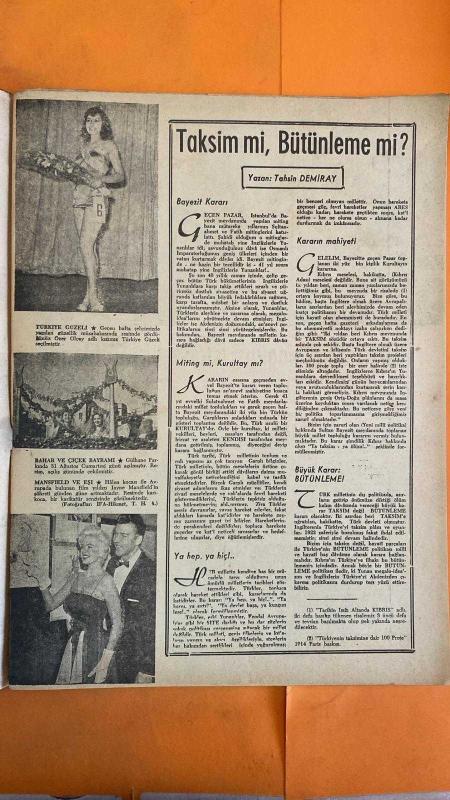 HAFTA MEMLEKET VE DÜNYA HADİSELERİNİ TAKİP EDER, HAFTANIN EN SEÇME YAZI VE RESİMLERİNİ VERİR, SİYASİ MECMUA DERGİSİ - 13 HAZİRAN 1958 SAYI: 24 ÖZER OLCAY - JAYNE MANSFIELD - TAHSiN DEMİRAY - FAZIL KÜÇÜK - BEHCET KEMAL ÇAĞLAR - BAKİ SÜHA EDİBOĞLU - EKREM HAKKI AYVERDİ - CELAL BAYAR - ADNAN MENDERES - JACKIE COLLINS - JOAN COLLINS - MAKARIOS - KIBRIS TÜRKLERİ - EOKA - BAYEZİT MİTİNGİ - “YA TAKSİM YA ÖLÜM” SLOGANI - KIBRIS MİTİNGİ VE KURULTAY ANLAYIŞI - TÜRK DIŞ POLİTİKASINDA BÜTÜNLEME TEZİ - HAYDARPAŞA LİMAN VE SİLO AÇILIŞI - GALATASARAY LİSESİ SENE SONU MÜSAMERESİ - YANDAN YIRTMAÇLI ELBİSE MODASI - BEYAZ SETEN TUVALET MODASI - SULTANAHMET VE FATİH MİTİNGLERİ HATIRLATMASI - İNGİLİZ VE YUNAN SİYASETİNE ELEŞTİRİ - TÜRK MİLLETİNİN KARAR VE HAREKET TARZI - KIBRIS’TA BOMBALI SALDIRILAR VE ÇATIŞMALAR - LONDRA RADYOSU YANLI HABER ELEŞTİRİSİ - TÜRKİYE GÜZELİ SEÇİMİ - GÜLHANE BAHAR VE ÇİÇEK BAYRAMI AÇILIŞI - HİLMİ ZİYA ÜLKEN - ZİYAETTİN FAHRİ FINDIKOĞLU - ÖMER CELAL SARAÇ - MÜMTAZ TUR - 28 SAYFA, Tahsin Demiray tarafından kaleme alınmıştır. HAFTA MEMLEKET VE DÜNYA HADİSELERİNİ TAKİP EDER, HAFTANIN EN SEÇME YAZI VE RESİMLERİNİ VERİR, SİYASİ MECMUA DERGİSİ - 13 HAZİRAN 1958 SAYI: 24 ÖZER OLCAY - JAYNE MANSFIELD - TAHSiN DEMİRAY - FAZIL KÜÇÜK - BEHCET KEMAL ÇAĞLAR - BAKİ SÜHA EDİBOĞLU - EKREM HAKKI AYVERDİ - CELAL BAYAR - ADNAN MENDERES - JACKIE COLLINS - JOAN COLLINS - MAKARIOS - KIBRIS TÜRKLERİ - EOKA - BAYEZİT MİTİNGİ - “YA TAKSİM YA ÖLÜM” SLOGANI - KIBRIS MİTİNGİ VE KURULTAY ANLAYIŞI - TÜRK DIŞ POLİTİKASINDA BÜTÜNLEME TEZİ - HAYDARPAŞA LİMAN VE SİLO AÇILIŞI - GALATASARAY LİSESİ SENE SONU MÜSAMERESİ - YANDAN YIRTMAÇLI ELBİSE MODASI - BEYAZ SETEN TUVALET MODASI - SULTANAHMET VE FATİH MİTİNGLERİ HATIRLATMASI - İNGİLİZ VE YUNAN SİYASETİNE ELEŞTİRİ - TÜRK MİLLETİNİN KARAR VE HAREKET TARZI - KIBRIS’TA BOMBALI SALDIRILAR VE ÇATIŞMALAR - LONDRA RADYOSU YANLI HABER ELEŞTİRİSİ - TÜRKİYE GÜZELİ SEÇİMİ - GÜLHANE BAHAR VE ÇİÇEK BAYRAMI AÇILIŞI - HİLMİ ZİYA ÜLKEN - ZİYAETTİN FAHRİ FINDIKOĞLU - ÖMER CELAL SARAÇ - MÜMTAZ TUR - 28 SAYFA adlı eser Türkçe dilindedir.