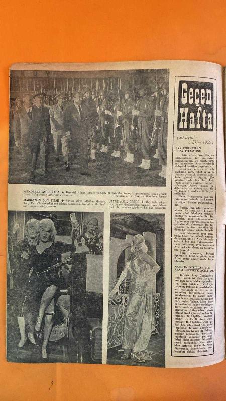 HAFTA MEMLEKET VE DÜNYA HADİSELERİNİ TAKİP EDER, HAFTANIN EN SEÇME YAZI VE RESİMLERİNİ VERİR, SİYASİ MECMUA DERGİSİ - 14 EKİM 1959 SAYI: 42 - MARTHA HYER - SILVIA KOSENKA - PATRICA KARIM - BRIGITTE BARDOT - ADNAN MENDERES - MARILYN MONROE - TONY CURTIS - JAYNE MANSFIELD - HALİT BEKTAŞ - H. FİKRİ VEREL - EN GÜZEL VÜCUTLU YILDIZ - ÇİÇEĞİ BURNUNDA - YENİ BİR BOMBA - KOMBİNEZON ARTIK SOKAKTA GİYİLİYOR - MENDERES AMERİKA'DA - MARILYN'İN SON FİLMİ - JAYNE HALA GÖZDE - AYA FIRLATILAN FEZA İSTASYONU - NASIR'IN KIZILLAR İLE ARASI GİTTİKÇE AÇILIYOR - DANS İNSANI VAHŞİLEŞTİRİYOR MU - DİNİ DANSLAR VE HALK OYUNLARI - DIANA DORS - SEMİRAMİS - BRIGITTE BARDOT - MARTINE CAROL - MYRNA LOY - CLAUDETTE COLBERT - MAUREEN O’HARA - TALÂT ARTAMEL - RAHMİ HAVVA - OĞUZ ÖZDEŞ - ŞEMSİ BELLİ - DR. KÜÇÜK - RAUF DENKTAŞ - HALİD KÂZIM - GRİVAS - NECLA OKTAY - U. MESE - FİLMLERDE ÇIPLAK SAHNELER - TÜRKLERDEN TÜRK’E KAMPANYASI - KIBRIS’TA İÇKİ VE KUMAR MÜCADELESİ - KIBRIS’TA İKTİSADİ ŞAHLANIŞ - 36 SAYFA, Tahsin Demiray tarafından kaleme alınmıştır. HAFTA MEMLEKET VE DÜNYA HADİSELERİNİ TAKİP EDER, HAFTANIN EN SEÇME YAZI VE RESİMLERİNİ VERİR, SİYASİ MECMUA DERGİSİ - 14 EKİM 1959 SAYI: 42 - MARTHA HYER - SILVIA KOSENKA - PATRICA KARIM - BRIGITTE BARDOT - ADNAN MENDERES - MARILYN MONROE - TONY CURTIS - JAYNE MANSFIELD - HALİT BEKTAŞ - H. FİKRİ VEREL - EN GÜZEL VÜCUTLU YILDIZ - ÇİÇEĞİ BURNUNDA - YENİ BİR BOMBA - KOMBİNEZON ARTIK SOKAKTA GİYİLİYOR - MENDERES AMERİKA'DA - MARILYN'İN SON FİLMİ - JAYNE HALA GÖZDE - AYA FIRLATILAN FEZA İSTASYONU - NASIR'IN KIZILLAR İLE ARASI GİTTİKÇE AÇILIYOR - DANS İNSANI VAHŞİLEŞTİRİYOR MU - DİNİ DANSLAR VE HALK OYUNLARI - DIANA DORS - SEMİRAMİS - BRIGITTE BARDOT - MARTINE CAROL - MYRNA LOY - CLAUDETTE COLBERT - MAUREEN O’HARA - TALÂT ARTAMEL - RAHMİ HAVVA - OĞUZ ÖZDEŞ - ŞEMSİ BELLİ - DR. KÜÇÜK - RAUF DENKTAŞ - HALİD KÂZIM - GRİVAS - NECLA OKTAY - U. MESE - FİLMLERDE ÇIPLAK SAHNELER - TÜRKLERDEN TÜRK’E KAMPANYASI - KIBRIS’TA İÇKİ VE KUMAR MÜCADELESİ - KIBRIS’TA İKTİSADİ ŞAHLANIŞ - 36 SAYFA adlı eser Türkçe dilindedir.
