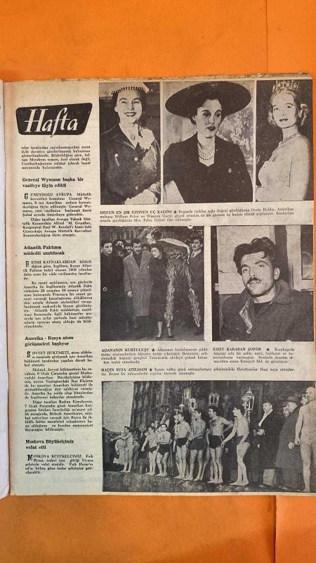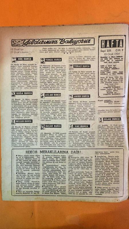 HAFTA MEMLEKET VE DÜNYA HADİSELERİNİ TAKİP EDER, HAFTANIN EN SEÇME YAZI VE RESİMLERİNİ VERİR, SİYASİ MECMUA DERGİSİ - SAYI: 225 15 OCAK 1954 TAHSİN DEMİRAY - CEMİL CAHİT CEM - SEZAİ SOLELLİ - OĞUZ ÖZDEŞ - BARBARA RUSH - REKOR MERAKLILARINA DAİR - BAYAN PFISTERHAMMER - HERDIS LARSEN - MAXIMO FERRER - ŞEFİKA REHVAN - DINO SURIANO - AMERICANO ANDREOLI - W. E. RIECK - POP MAYAAR - JULIO MORENO - TENDO OBAKAŞİ - BESSIE LIPMAN - MARINELLA LAMBRERCHI - DÜNYA REKORLARI - PATATES SOYMA REKORU - BİRA İÇME REKORU - BİSİKLETLE DÖNME REKORU - BİLARDO MARATONU - KOYUN KIRPMA REKORU - BİLYA ŞAMPİYONU - SUDA KALMA REKORU - PİRİN ÜZERİNE ŞİİR - TOKAT VE YEME REKORU - ÖPÜŞME REKORU - GÖĞÜS ÇEVRESİ REKORU - AVRUPA’DA ŞİDDETLİ KIŞ - YOLLARIN KAPANMASI - GÖZEN KREM - DR. NURİ SANDIKÇIOĞLU - CREME DE BEAUTE - KADIN GÜZELLİK ÜRÜNLERİ - HAFTALIK BURÇ YORUMLARI - DUYGUSAL VE MESLEKİ GELİŞMELER - ASTROLOJİK - 44 SAYFA, Tahsin Demiray tarafından kaleme alınmıştır. HAFTA MEMLEKET VE DÜNYA HADİSELERİNİ TAKİP EDER, HAFTANIN EN SEÇME YAZI VE RESİMLERİNİ VERİR, SİYASİ MECMUA DERGİSİ - SAYI: 225 15 OCAK 1954 TAHSİN DEMİRAY - CEMİL CAHİT CEM - SEZAİ SOLELLİ - OĞUZ ÖZDEŞ - BARBARA RUSH - REKOR MERAKLILARINA DAİR - BAYAN PFISTERHAMMER - HERDIS LARSEN - MAXIMO FERRER - ŞEFİKA REHVAN - DINO SURIANO - AMERICANO ANDREOLI - W. E. RIECK - POP MAYAAR - JULIO MORENO - TENDO OBAKAŞİ - BESSIE LIPMAN - MARINELLA LAMBRERCHI - DÜNYA REKORLARI - PATATES SOYMA REKORU - BİRA İÇME REKORU - BİSİKLETLE DÖNME REKORU - BİLARDO MARATONU - KOYUN KIRPMA REKORU - BİLYA ŞAMPİYONU - SUDA KALMA REKORU - PİRİN ÜZERİNE ŞİİR - TOKAT VE YEME REKORU - ÖPÜŞME REKORU - GÖĞÜS ÇEVRESİ REKORU - AVRUPA’DA ŞİDDETLİ KIŞ - YOLLARIN KAPANMASI - GÖZEN KREM - DR. NURİ SANDIKÇIOĞLU - CREME DE BEAUTE - KADIN GÜZELLİK ÜRÜNLERİ - HAFTALIK BURÇ YORUMLARI - DUYGUSAL VE MESLEKİ GELİŞMELER - ASTROLOJİK - 44 SAYFA adlı eser Türkçe dilindedir.