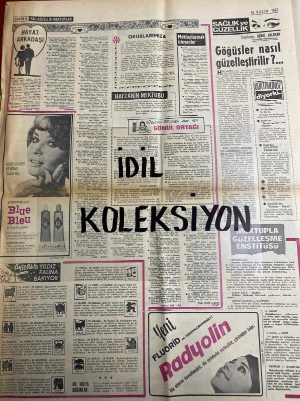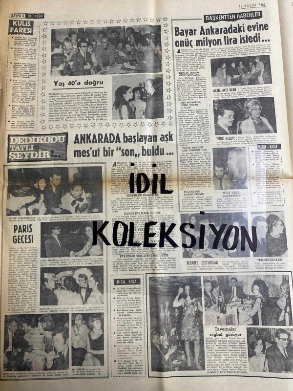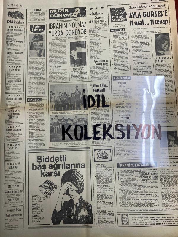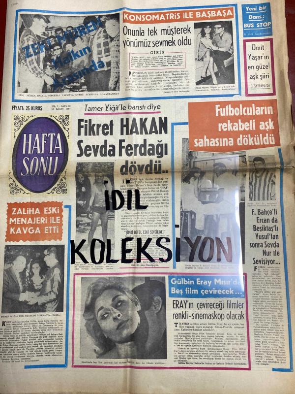 HAFTA SONU GAZETESİ DOĞUM GÜNÜ GAZETESİ (TURKİSH NEWSPAPER) - 16 KASIM 1967 - Yıl:1 Sayı:43- Yeni Çıkan Plaklar listesi -Zeki Müren-Fikret Hakan-Sevda Ferdağ-Tamer Yiğit-Zaliha-Sadıç Zaliha-Gülibin Eray-Peri-Han-Sevim Şengül-Durul Gence-Şahınbaş-Fatma Girik-İbrahim Solmaz-Ayla Gürses-George Lutrow-Altan Armağan-Jean Simmons-Richard Burton-Liz Taylor-Bayan Bayar-Bulent Karacan-Ali Şükrü-Muhterem Nur-Kemal İnci-Ümit Yaşar Konsomatris ile başbaşa-Onunla tek müşterek yönümüz sevmek oldu-Tamer Yiğit’le barıştı diye Fikret Hakan Sevda Ferdağı dövdü-Zaliha eski menajeri ile kavga etti-Futbolcuların rekabeti aşk sahasına döküldü-Gülibin Eray Mısır’da beş film çevirecek-Eray’ın çevireceği filmler renkli sinemaskop olacak-Sevim Şengül Peri-Han ile kavga etti-Kavga neticesi Sevim Şengül sahneye çıkmadı-Jet sosyete ve artistler Dolce Vita yaşadılar-Durul Gence ve balerin-Şahınbaş ile İsviçreli-Kendilerinden geçmişler-Sabaha kadar süren alemde herkes gönlünce eğlendi-Yeni dansları öğretiyoruz, Ali Yılmaz Ünlü tarafından kaleme alınmıştır. Eser İlhan Turalı editörlüğünde hazırlanmıştır. Kitap Hürriyet gazetecilik tarafından yayınlanmıştır. 8 sayfadır. HAFTA SONU GAZETESİ DOĞUM GÜNÜ GAZETESİ (TURKİSH NEWSPAPER) - 16 KASIM 1967 - Yıl:1 Sayı:43- Yeni Çıkan Plaklar listesi -Zeki Müren-Fikret Hakan-Sevda Ferdağ-Tamer Yiğit-Zaliha-Sadıç Zaliha-Gülibin Eray-Peri-Han-Sevim Şengül-Durul Gence-Şahınbaş-Fatma Girik-İbrahim Solmaz-Ayla Gürses-George Lutrow-Altan Armağan-Jean Simmons-Richard Burton-Liz Taylor-Bayan Bayar-Bulent Karacan-Ali Şükrü-Muhterem Nur-Kemal İnci-Ümit Yaşar Konsomatris ile başbaşa-Onunla tek müşterek yönümüz sevmek oldu-Tamer Yiğit’le barıştı diye Fikret Hakan Sevda Ferdağı dövdü-Zaliha eski menajeri ile kavga etti-Futbolcuların rekabeti aşk sahasına döküldü-Gülibin Eray Mısır’da beş film çevirecek-Eray’ın çevireceği filmler renkli sinemaskop olacak-Sevim Şengül Peri-Han ile kavga etti-Kavga neticesi Sevim Şengül sahneye çıkmadı-Jet sosyete ve artistler Dolce Vita yaşadılar-Durul Gence ve balerin-Şahınbaş ile İsviçreli-Kendilerinden geçmişler-Sabaha kadar süren alemde herkes gönlünce eğlendi-Yeni dansları öğretiyoruz adlı eser Türkçe dilindedir.