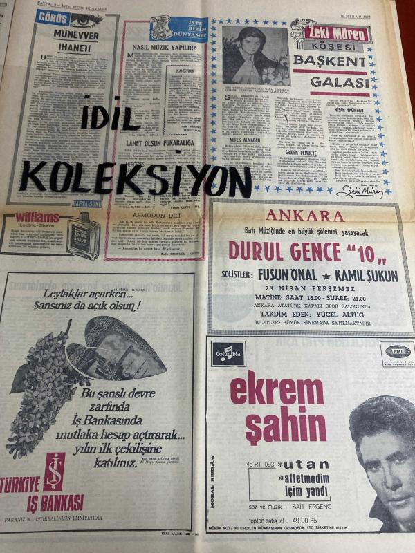HAFTA SONU GAZETESİ DOĞUM GÜNÜ GAZETESİ (TURKİSH NEWSPAPER) - 16 NİSAN 1970 - Yıl:4 Sayı:169 -Yeni Çıkan Plaklar listesi -Betül Işıl-Ertem Göreç-Zeki Tükel-Cüneyt Arkın-Sema Özcan-Müberra Arıkan-Suna Özden-Müjdat Gezen-Figen Say-Ayhan Işık-Göksel Arsoy-Sevda Aydan-Sevda Ferdag-İzzet Günay-Saime Sinan-Timur Selçuk-Engin Çağlar-Nilüfer Koçyiğit-Parla Şenol-Özdemir Güreli-Semra Yıldız-Bülent Oral-Alain Delon-Marie Versini-Romy Schneider-Shirley MacLaine-Kirk Douglas-Avni Anıl-Kamuran Akkor-Önder Bali-Orhan Şevki-Turhan Yalçın-Güngör Erdoğan-Erol Deran-İlham Gencer-Baki Duyarlar-Adriano Celentano-Nicola Di Bari-Sergio Endrigo-Zeki Müren-Kerem Güney-Sevgi Sun-Hafız Ahmet Sarıcaoğlu-Adnan Varveren-Nevzat Ayaz Söhretli yıldızlar filmcilere cephe aldı-Cüneyt Arkın’ı nişanlısı dövdü-5 sanatçı Ankara’da saç saça kavga etti-İranlılar Ayhan Işık’a el attılar-Göksel Arsoy’un evine hırsız girdi-Sema Özcan’la İzzet Günay’ın arası açıldı-Müzisyenlerin seçim mücadelesi hızlandı-Sevda Aydan aradığı eser adlı eser, Kitap > Süreli Yayınlar > Gazeteler > Türkiye > Genel > Günlük kategorisinde İkinci El olarak satıştadır.
