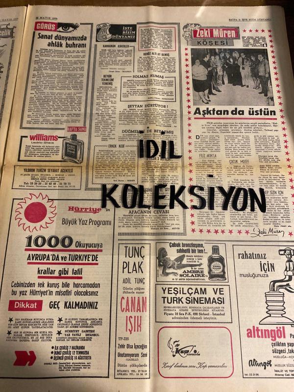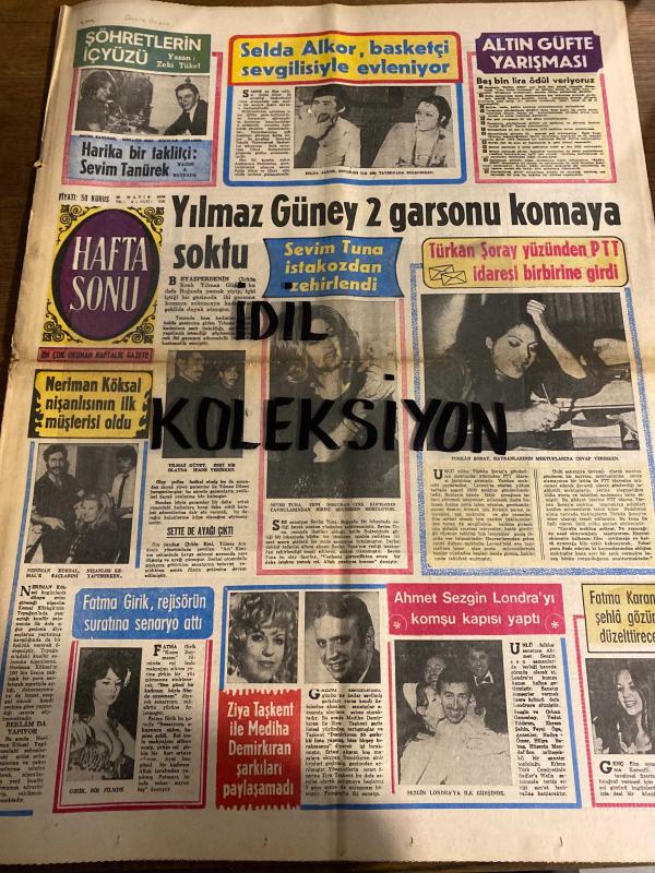 HAFTA SONU GAZETESİ DOĞUM GÜNÜ GAZETESİ (TURKİSH NEWSPAPER) - 28 MAYIS 1970 - Yıl:4 Sayı:175 -Yeni Çıkan Plaklar listesi -Sevim Tanürek – Selda Alkor – Yılmaz Güney – Sevim Tuna – Türkan Şoray – Neriman Köksal – Selma Güneri – Fatma Girik – Ziya Taşkent – Mediha Demirkıran – Ahmet Sezgin – Fatma Karanfil – Yıldızlar prodüktörlere karşı cephe aldı – Rüçhan Çamay – Münir Nurettin – Nevin Kardeş – Ümit Utku – Yalçın Gülhan – Zuhal Aktan – Ayhan Işık – Emel Sayın – Engin Çağlar – Hülya Darcan – Piraye Uzun – Halit Refiğ – Zaliha – Juanito – Serpil Örümcer – Nazan Şoray – Harika bir taklitçi Sevim Tanürek – B. Bardot – M. Laforet – David Niven – Florinda Bolkan – Alain Delon – Şantör Alpay – Nesrin Sipahi – Erkin Koray – Sheila – Sylvie – Ardağan – Muammer Yeşil – Burhan Damcıoğlu – Devletin müzik faaliyetlerini denetlemesi istendi – Vedat Sunay – Ali Ersöz – Ali – Siyah gözlerin – Kuru intihar – Ahlâk buhranı – Kahraman askerler – Solmaz kumaş – Şeytan dürtüyor – Düğmenin de beyni var – Du, Ali Yılmaz Ünlü tarafından kaleme alınmıştır. Eser İlhan Turalı editörlüğünde hazırlanmıştır. Kitap Hürriyet gazetecilik tarafından yayınlanmıştır. 10 sayfadır. HAFTA SONU GAZETESİ DOĞUM GÜNÜ GAZETESİ (TURKİSH NEWSPAPER) - 28 MAYIS 1970 - Yıl:4 Sayı:175 -Yeni Çıkan Plaklar listesi -Sevim Tanürek – Selda Alkor – Yılmaz Güney – Sevim Tuna – Türkan Şoray – Neriman Köksal – Selma Güneri – Fatma Girik – Ziya Taşkent – Mediha Demirkıran – Ahmet Sezgin – Fatma Karanfil – Yıldızlar prodüktörlere karşı cephe aldı – Rüçhan Çamay – Münir Nurettin – Nevin Kardeş – Ümit Utku – Yalçın Gülhan – Zuhal Aktan – Ayhan Işık – Emel Sayın – Engin Çağlar – Hülya Darcan – Piraye Uzun – Halit Refiğ – Zaliha – Juanito – Serpil Örümcer – Nazan Şoray – Harika bir taklitçi Sevim Tanürek – B. Bardot – M. Laforet – David Niven – Florinda Bolkan – Alain Delon – Şantör Alpay – Nesrin Sipahi – Erkin Koray – Sheila – Sylvie – Ardağan – Muammer Yeşil – Burhan Damcıoğlu – Devletin müzik faaliyetlerini denetlemesi istendi – Vedat Sunay – Ali Ersöz – Ali – Siyah gözlerin – Kuru intihar – Ahlâk buhranı – Kahraman askerler – Solmaz kumaş – Şeytan dürtüyor – Düğmenin de beyni var – Du adlı eser Türkçe dilindedir.